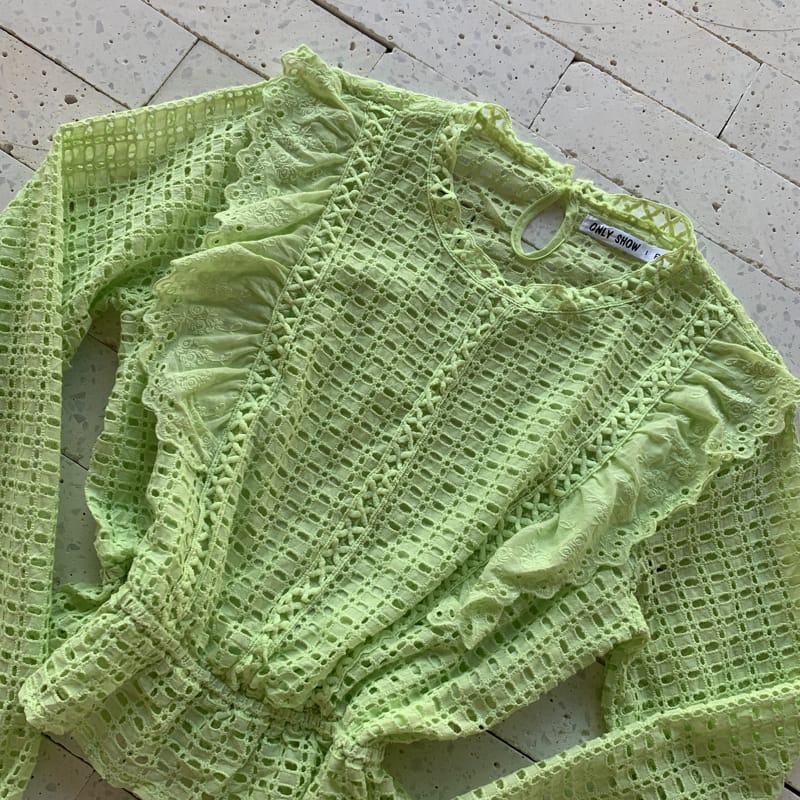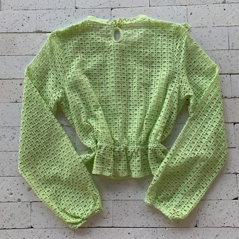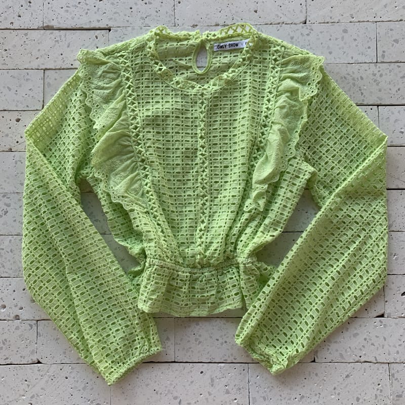 CROPPED MANGA LONGA EM LAISE COM BABADOS LUXO VERDE LIMÃO