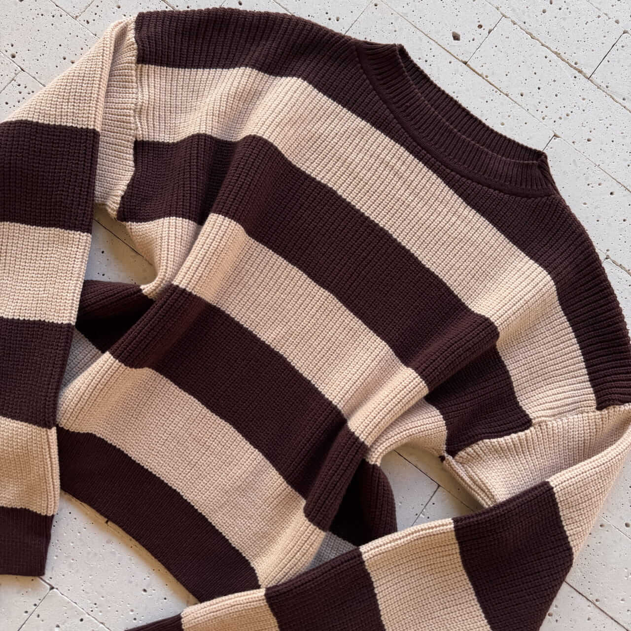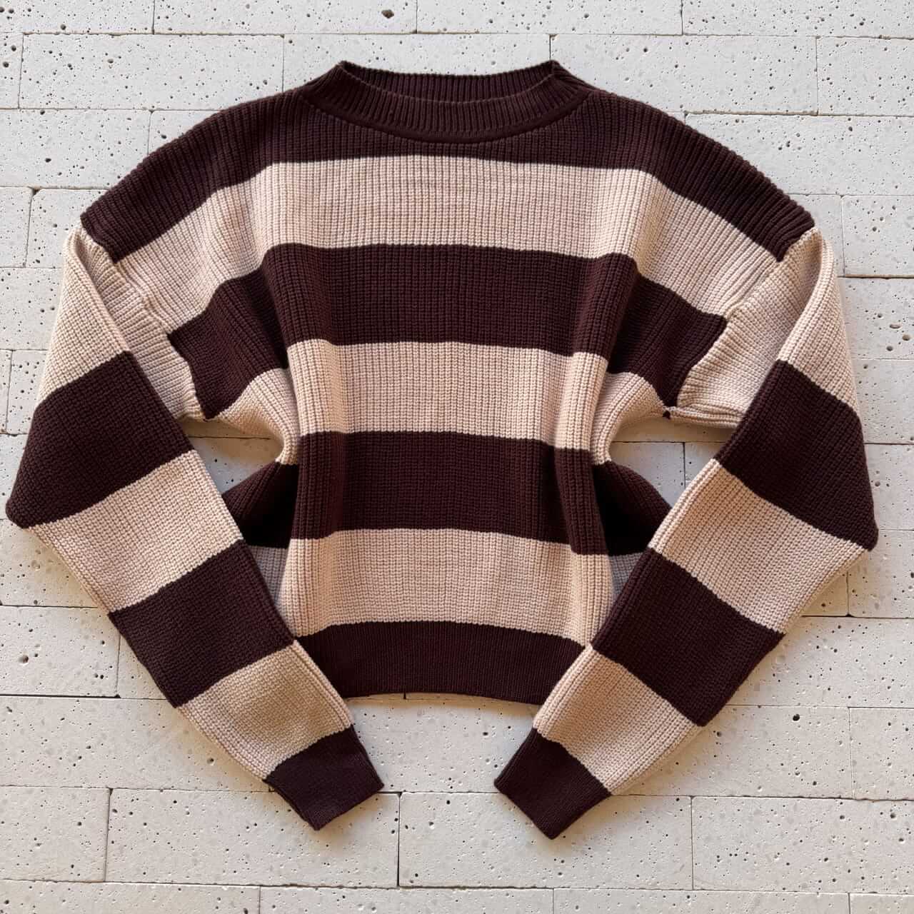 Cropped Tricô Alongado Manga Longa Listrado Café e Bege – Conforto Elegante com Tons Atemporais