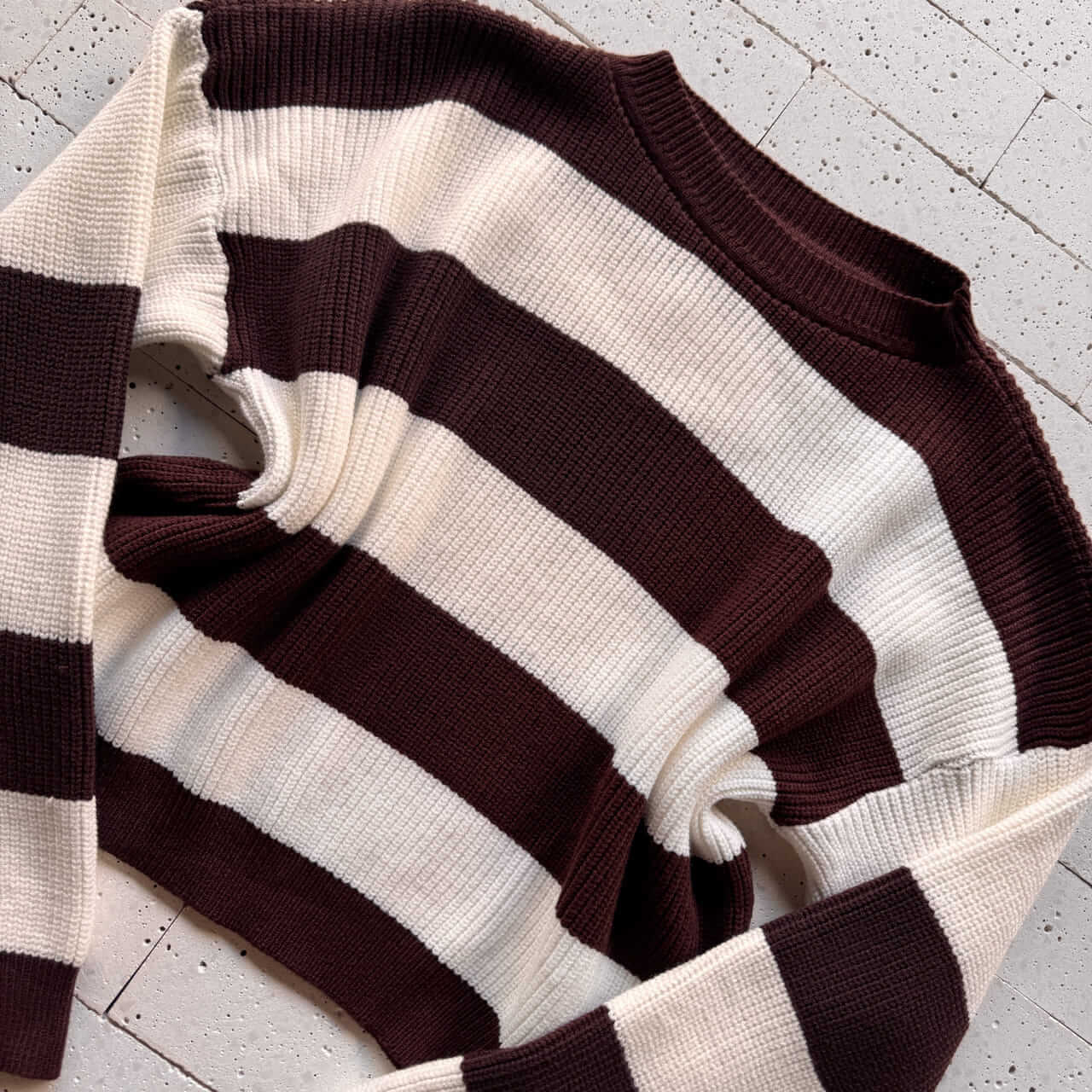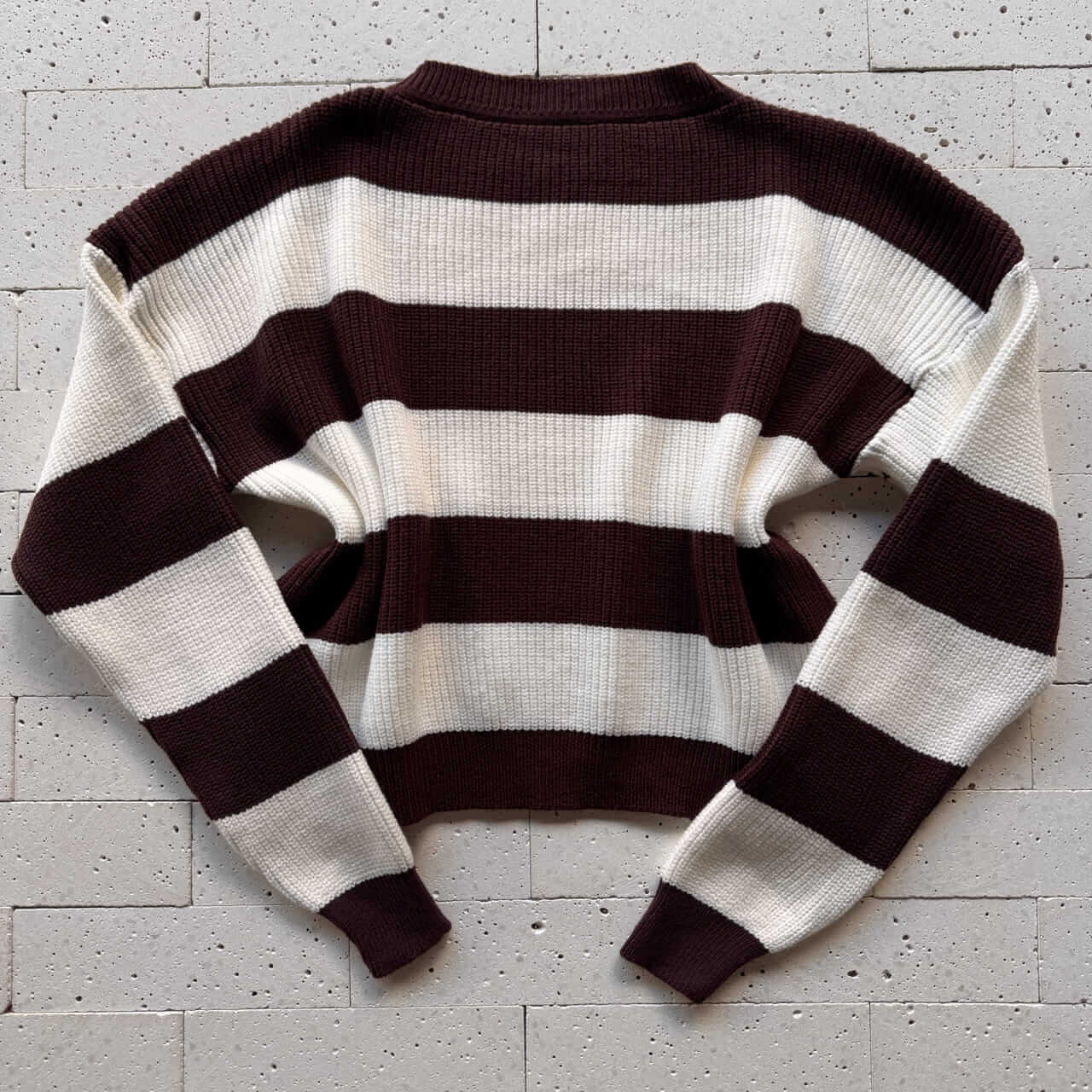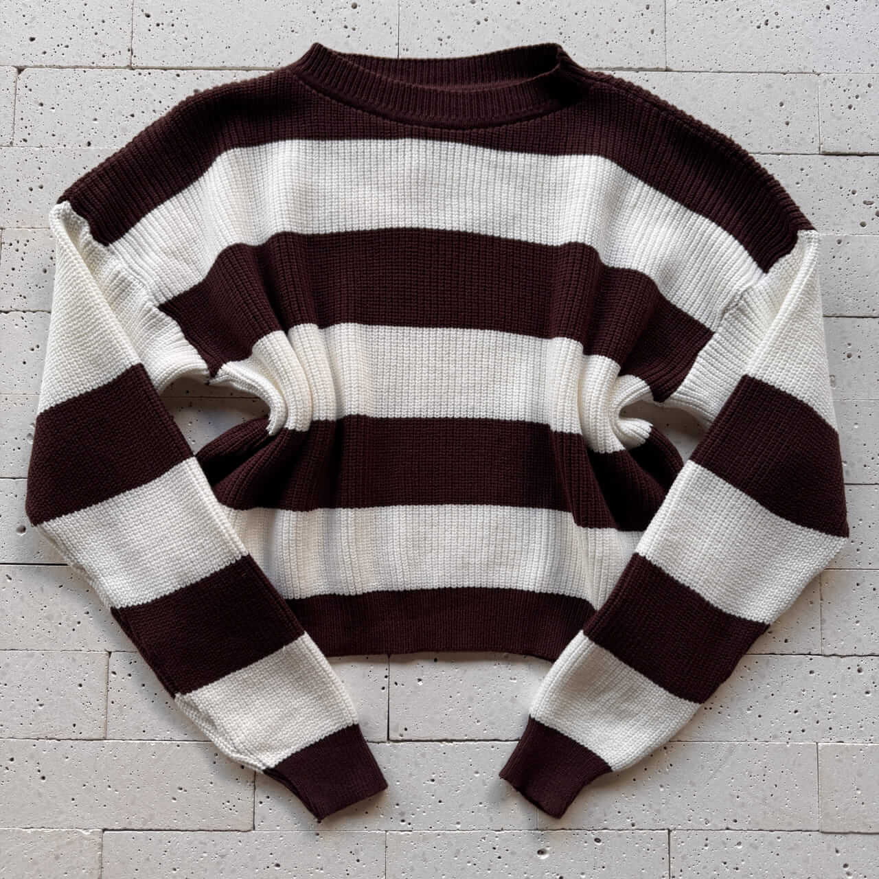 Cropped Tricô Alongado Manga Longa Listrado Café – Conforto Elegante com Toque Contemporâneo