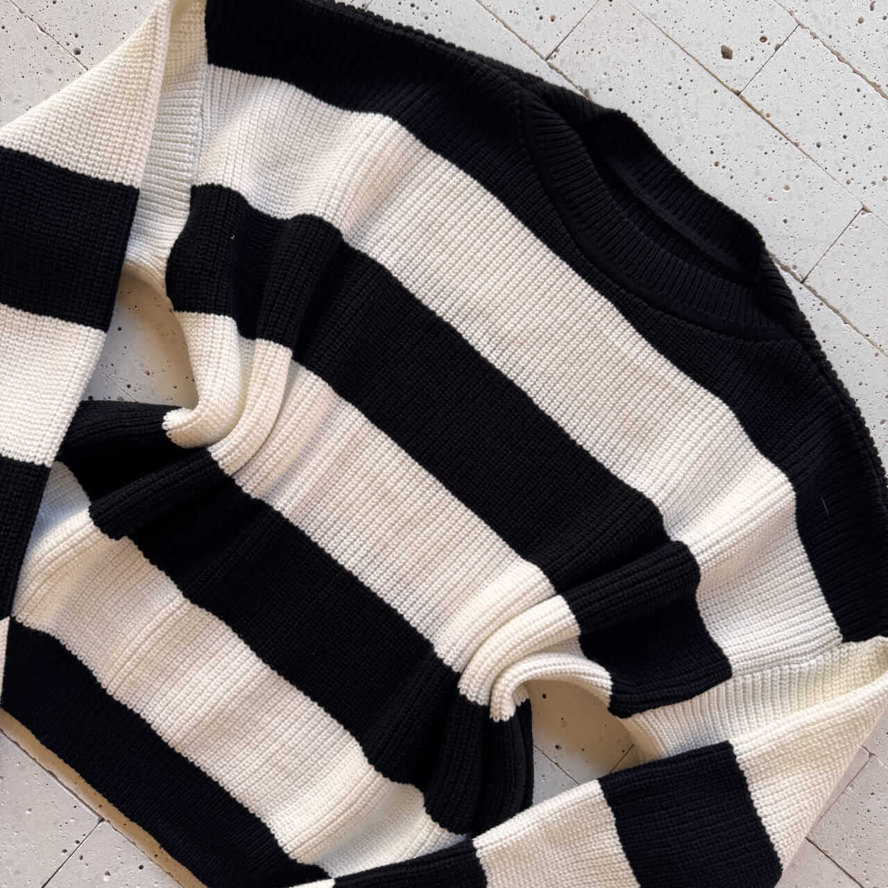 Cropped Tricô Alongado Manga Longa Listrado Preto – Conforto Moderno com Estilo Atemporal