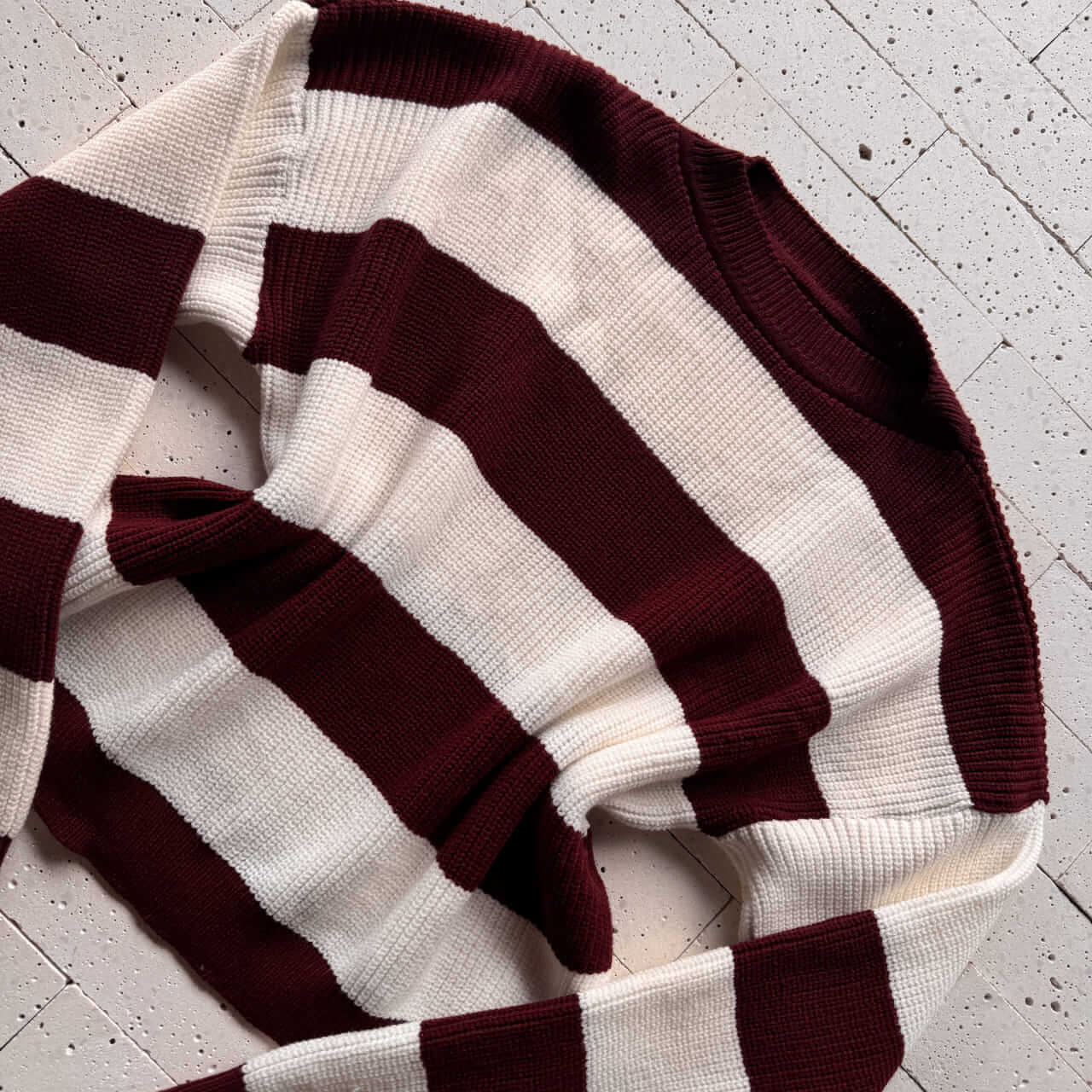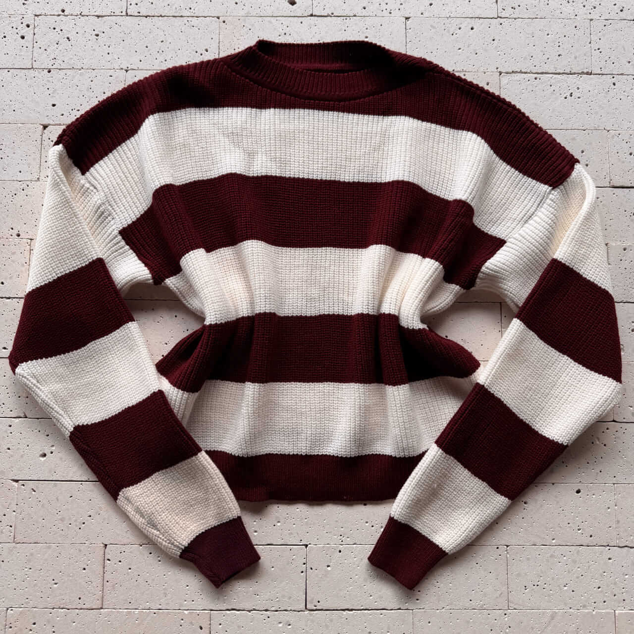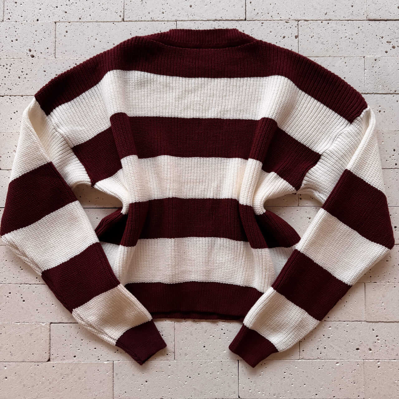 Cropped Tricô Alongado Manga Longa Listrado Vinho – Elegância Intensa com Conforto Moderno