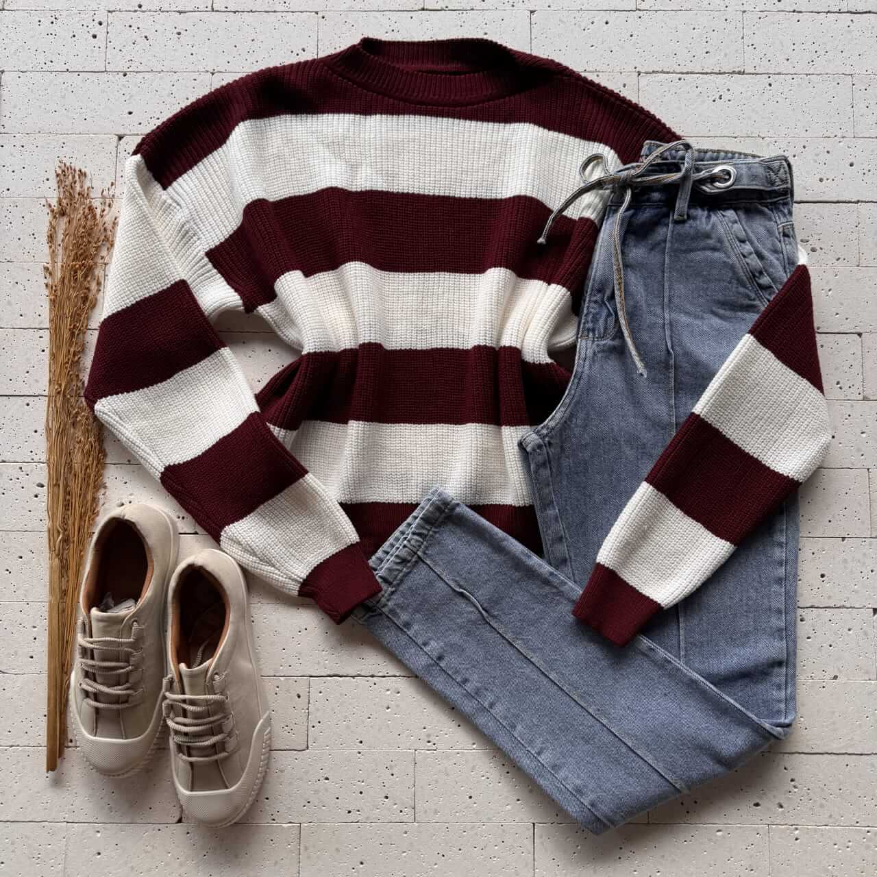 Como Usar o Cropped Tricô Alongado Manga Longa Listrado Vinho