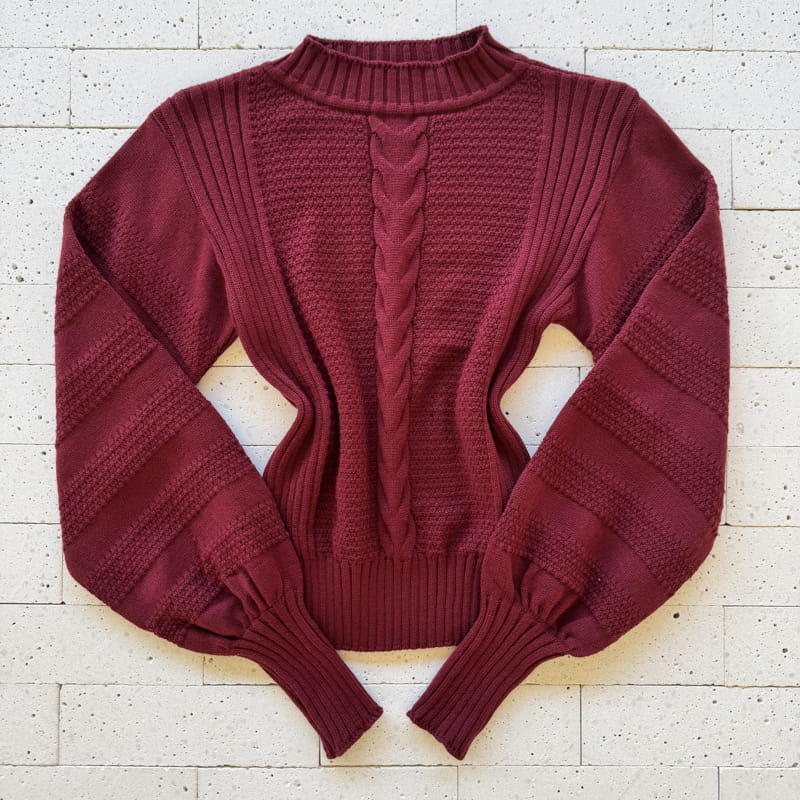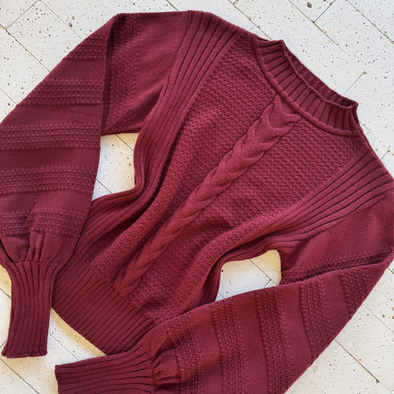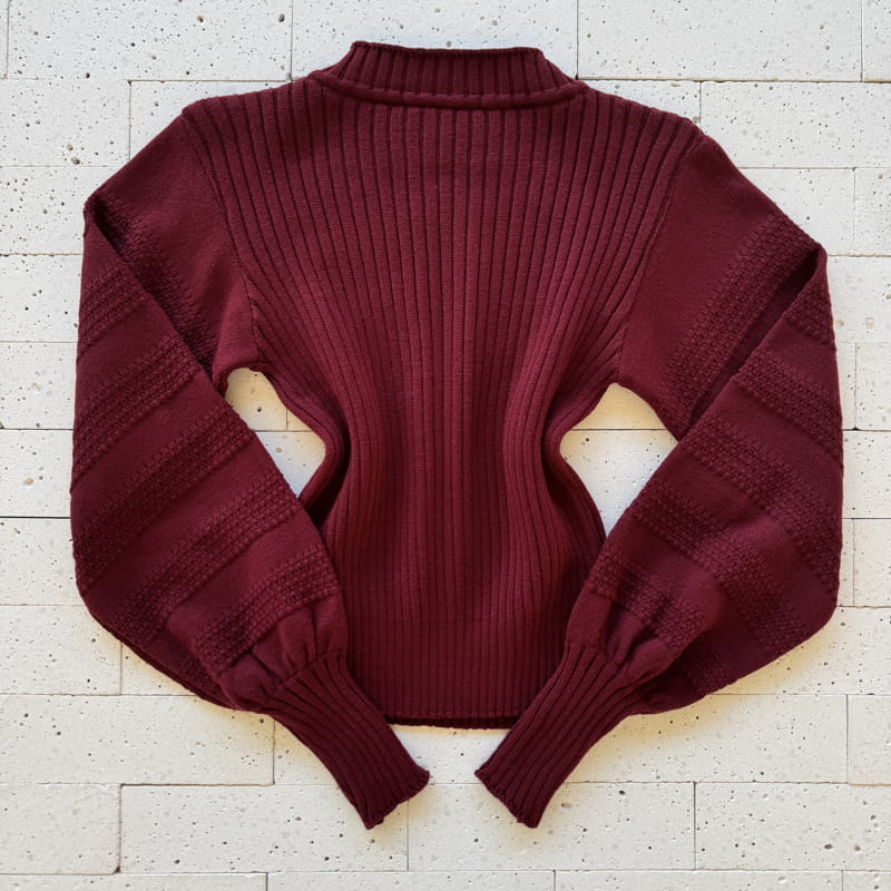 CROPPED TRICO ALONGADO MANGA OVERSIZED COM TRAMA FRONTAL VINHO