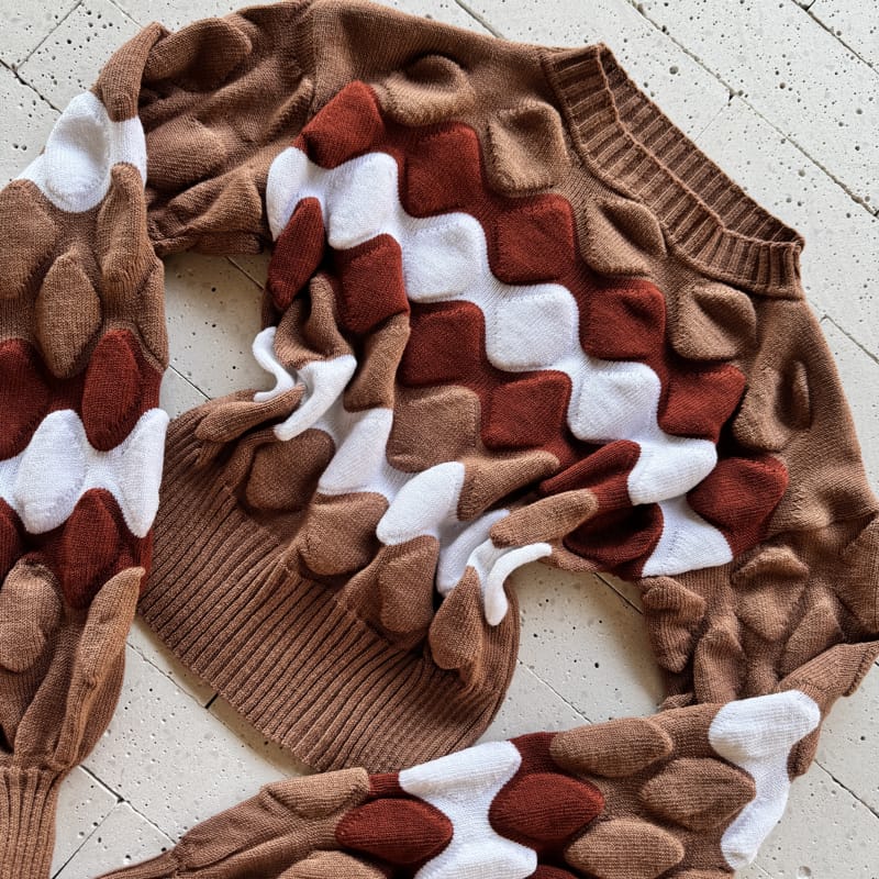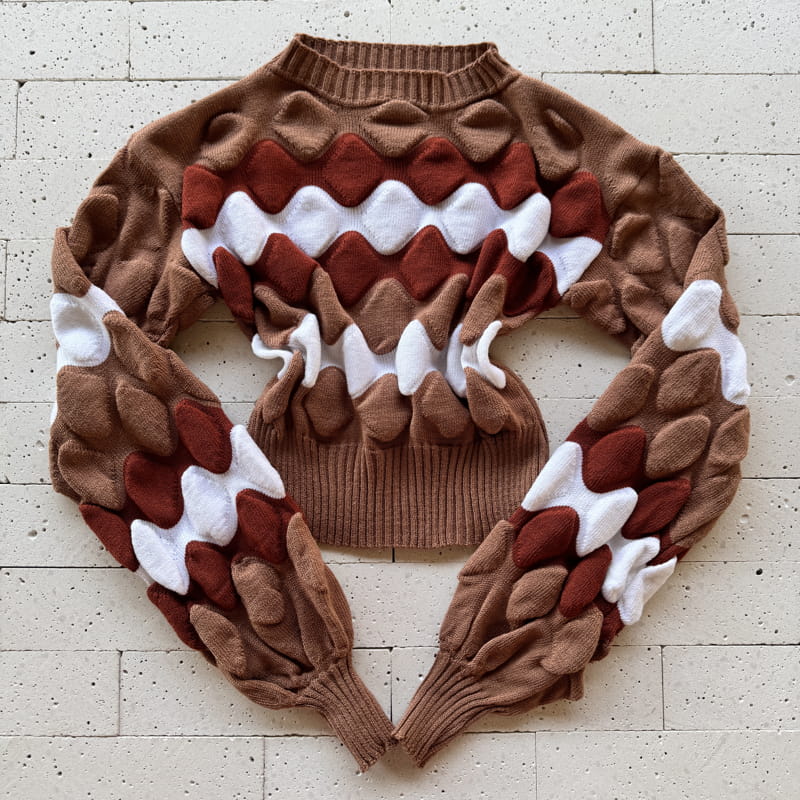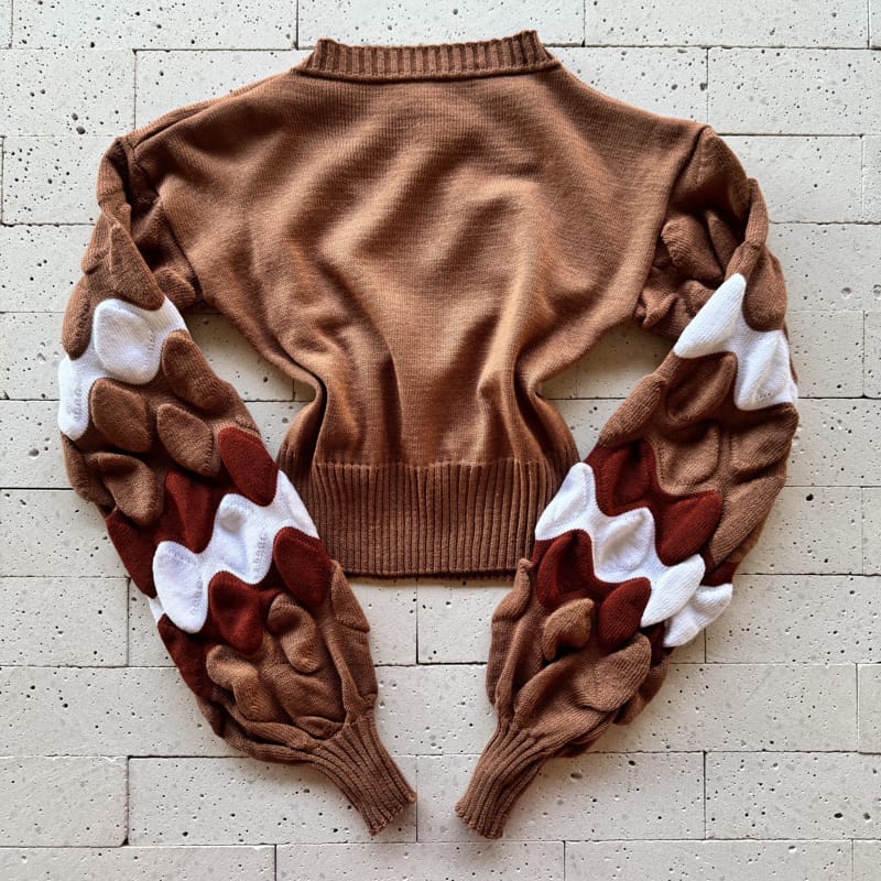 O Cropped Tricot Color Geométrico Nude é a escolha perfeita para quem busca um visual ousado e estiloso no inverno. Com um design exclusivo que mistura tons terrosos com branco em relevos geométricos tridimensionais, ele impressiona por sua originalidade e sofisticação. As mangas bufantes com punhos marcados proporcionam um toque dramático e aconchegante, enquanto a modelagem ajustada na cintura valoriza a silhueta. O trico encorpado, com excelente elasticidade, garante conforto e caimento impecável.