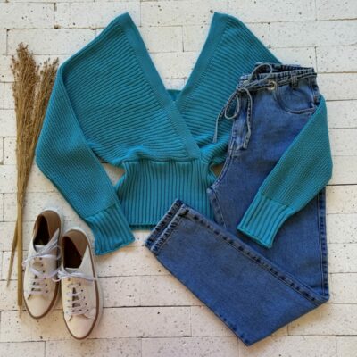 Escolha seu Cropped Trico Manga Longa Decote Transpassado Azul com nosso PROVADOR VIRTUAL
