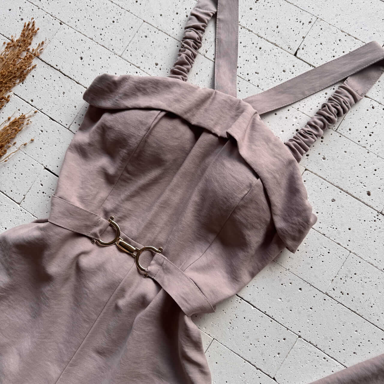 MACACÃO COM CINTO DE FIVELA DOURADA E BOJO NUDE – Elegância Atemporal em Marrant