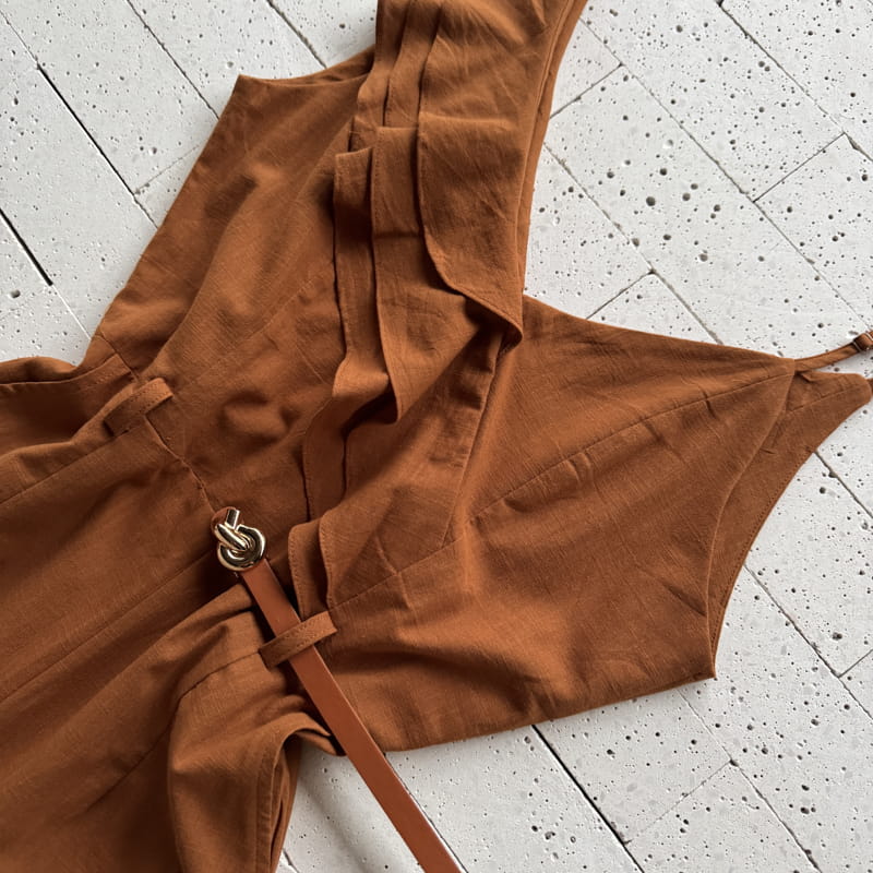 MACACÃO LINHO COM CINTO E ALÇA BABADO CARAMELO
