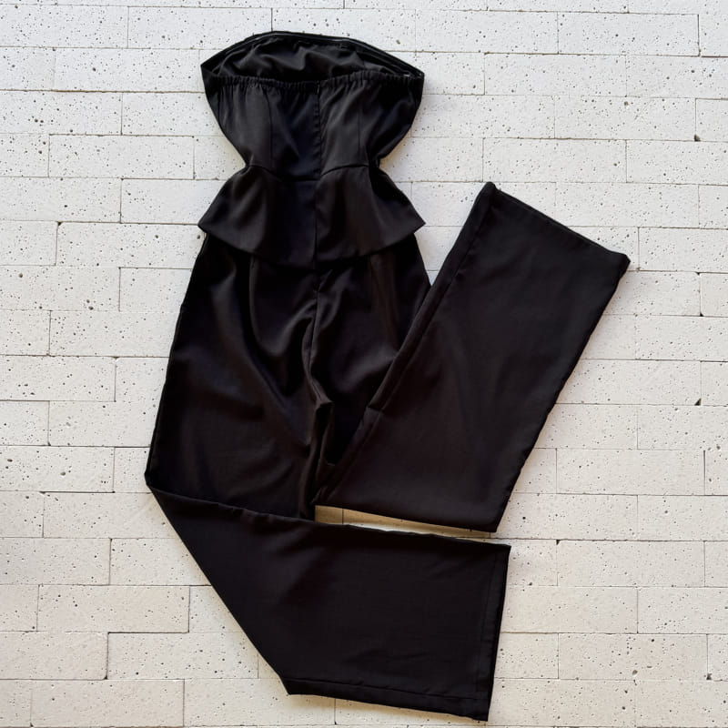 O Macacão Tomara que Caia Detalhe Botões Luxo Preto é a peça que une sofisticação e versatilidade com um toque de ousadia. Com design estruturado, o busto tomara que caia ganha destaque com aplicação de botões dourados, conferindo charme e elegância ao visual. O detalhe peplum na cintura valoriza as curvas e proporciona acabamento refinado. Possui elástico nas costas para ajuste confortável, zíper invisível e calça reta de caimento impecável. Uma escolha certeira para ocasiões especiais e produções noturnas impactantes.
