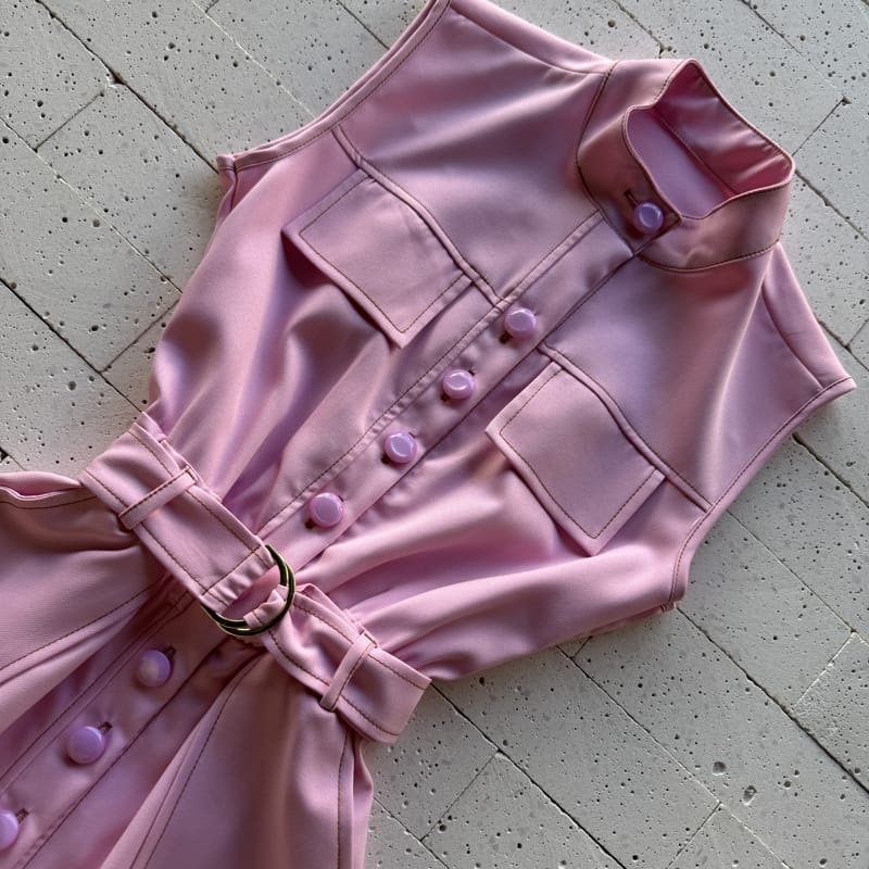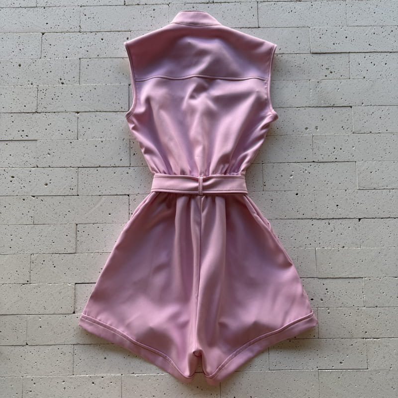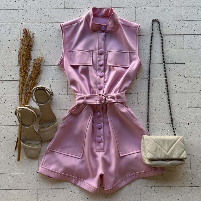 Este macaquinho une o charme da alfaiataria com um toque contemporâneo em um tom rosa claro sofisticado. O modelo sem mangas apresenta gola alta estruturada, fechamento frontal com botões forrados e bolsos frontais decorativos. Acompanha cinto faixa no mesmo tecido, com fivela metálica, que valoriza a silhueta e adiciona elegância ao visual. O tecido encorpado com leve elasticidade oferece ótimo caimento, enquanto o acabamento bem trabalhado realça o estilo luxuoso da peça.