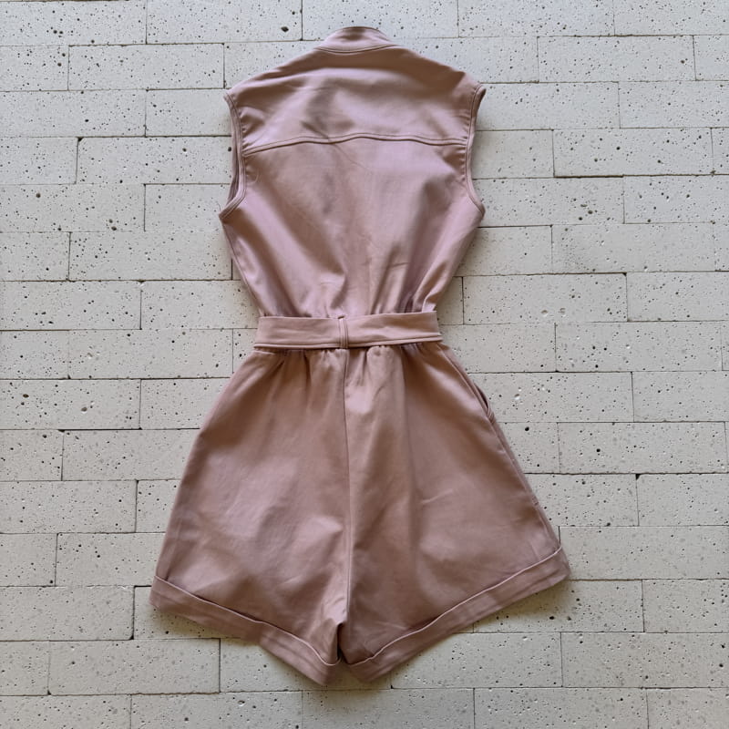 Combine com sandálias de salto bloco e bolsa tiracolo para um look elegante de verão. Para ocasiões casuais, aposte em tênis branco e jaqueta leve. O tom rosê e os detalhes utilitários tornam esse macaquinho uma peça versátil para o dia a dia ou produções mais arrumadinhas.