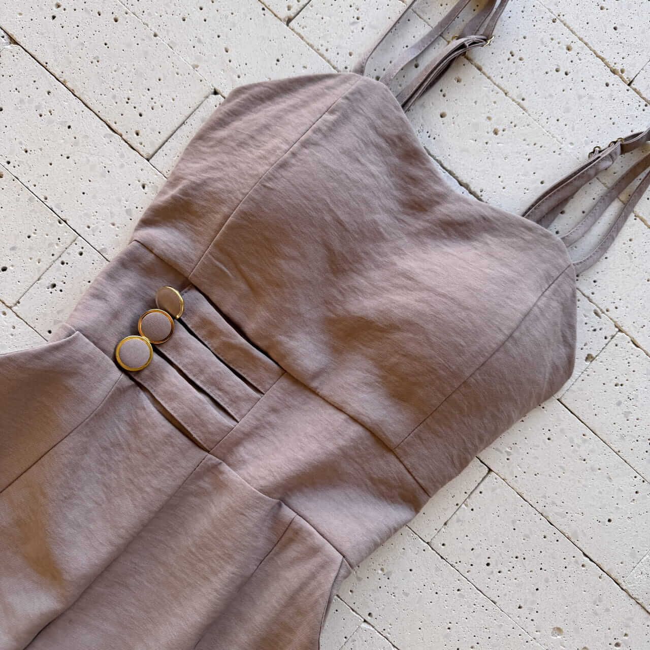 - Botões forrados com aro dourado aplicados na cintura