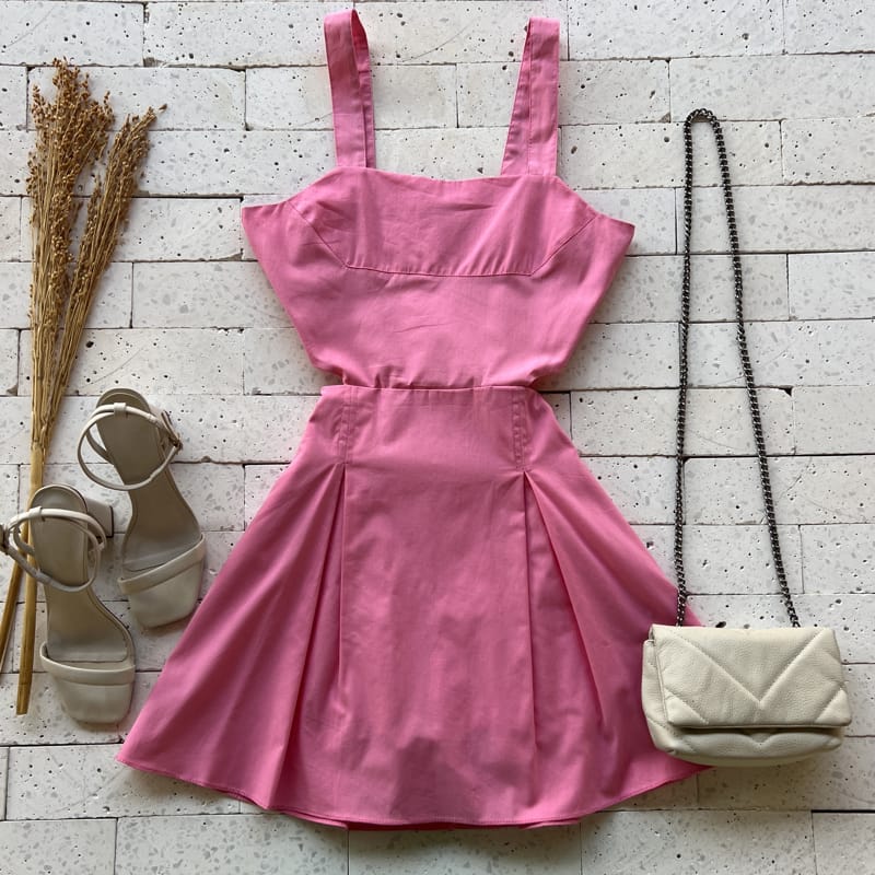 Escolha seu Macaquinho Tricoline Rodado com Abertura na Cintura Rosa com nosso PROVADOR VIRTUAL