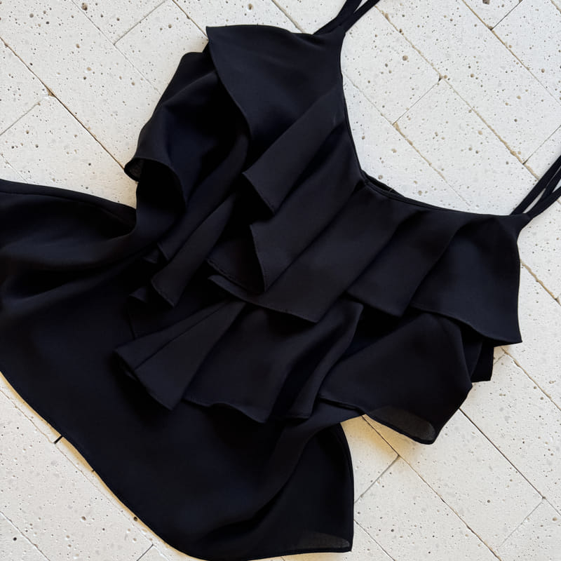 REGATA BOHO CHIFON LUXO PRETA – Sofisticação Atemporal com Babados Elegantes