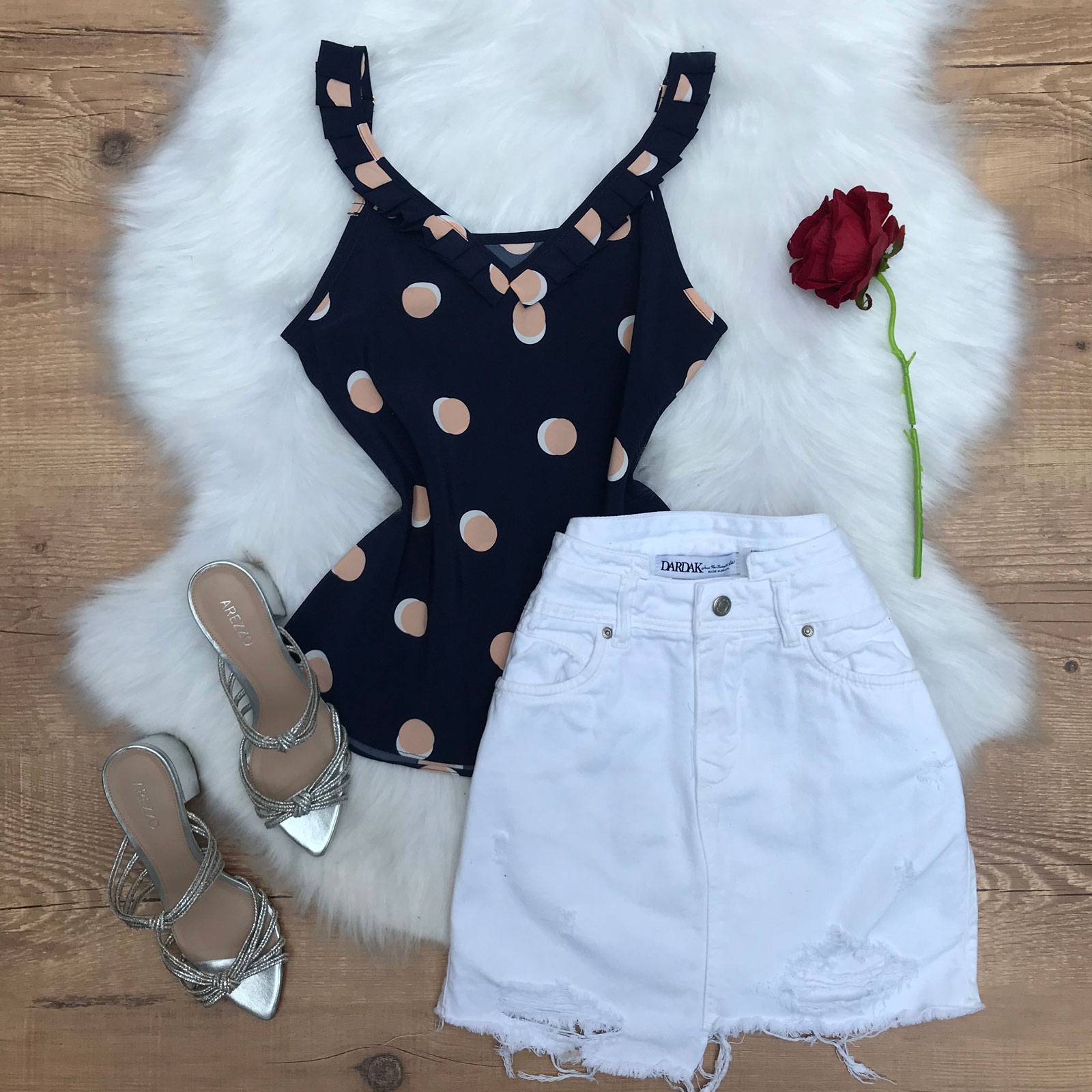 A Regata Detalhe Decote e Alça Azul Marinho é o modelo perfeito para você curtir o verão! A regata é confeccionada no tecido crepe, o queridinho das mulheres, ele é um material produzido com vários tipos de fibras, encontrado em seda, algodão e viscose. O decote em “V” forma uma linha divisória que dirige o olhar no sentido vertical, alongando o pescoço e diminuindo o tamanho dos ombros e nessa peça ele vem com detalhes em pregas. A alça é fina e tem o sistema de regulagem para deixar no tamanho certo para cada biotipo. A cor azul marinho vem acompanhada com estampa em bolas brancas e nudes, a cor pode ser apostada com outras estampas, fica lindo! Mas se você prefere um look mais elegante, você pode fazer looks com tons mais escuros ou peças em tons neutros, como por exemplo, laranja e amarelo. Eles fazem uma excelente combinação com o azul marinho.