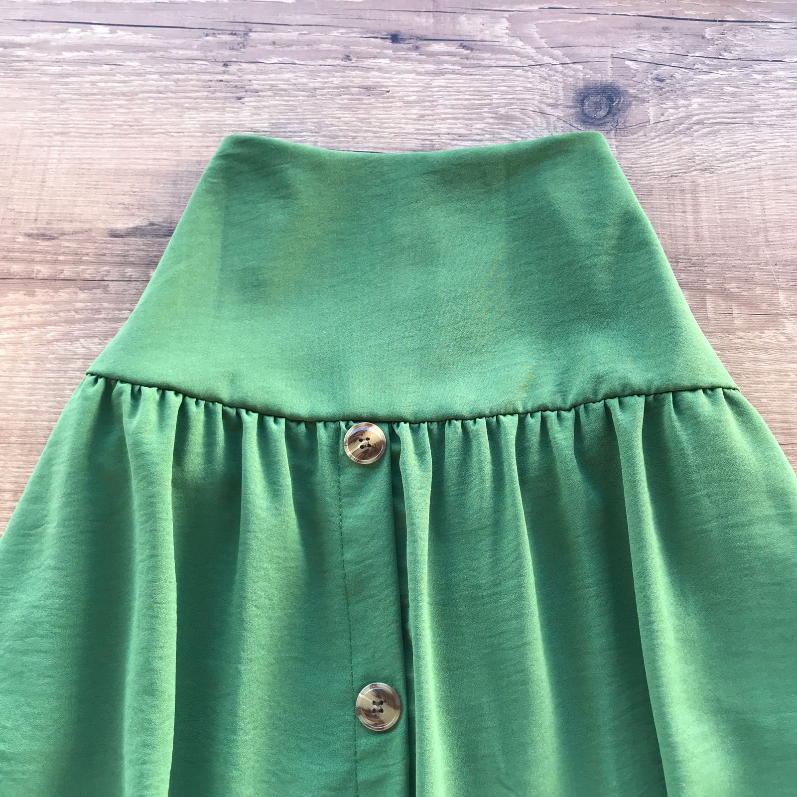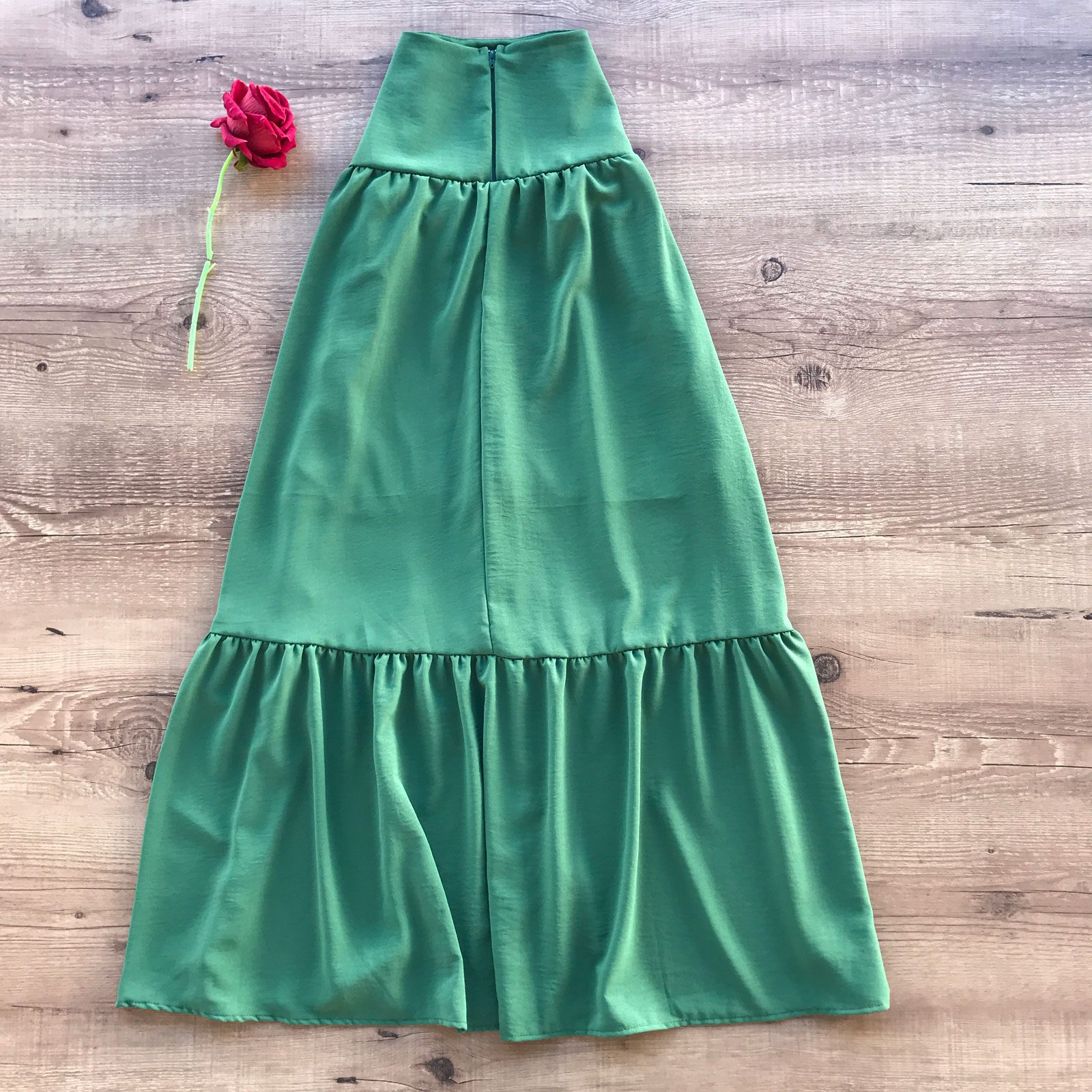 A Saia Longa Barrados e Botões Verde é produzida em crepe de alta qualidade que oferece uma leveza e fluidez únicas. Os botões fake presentes na extensão frontal dão ainda mais charme à peça que apresenta detalhes em barrados. Esta é a melhor opção para quem ama um look romântico!