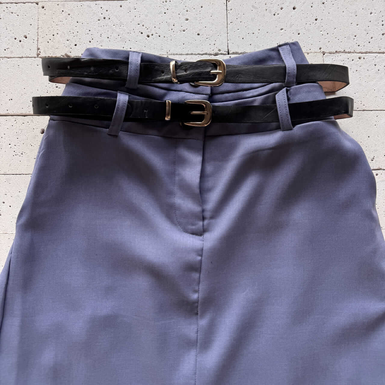 - Cintura alta com detalhe de cinto duplo com fivelas metálicas