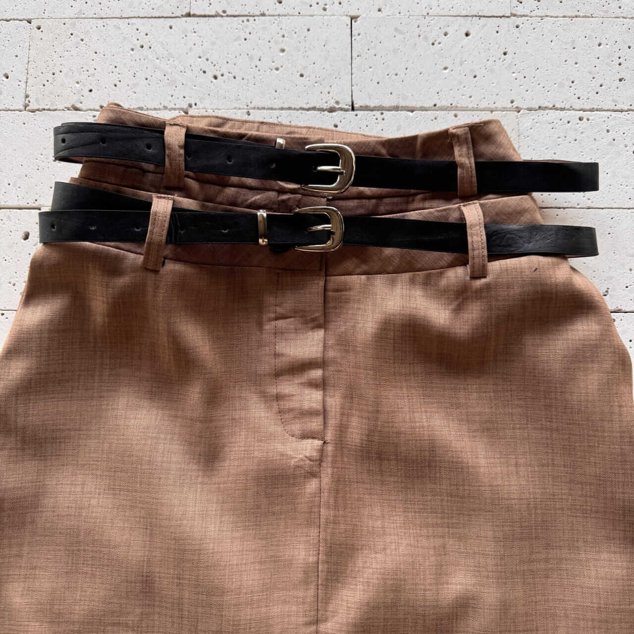 - Cintura alta com detalhe de cinto duplo com fivelas metálicas
