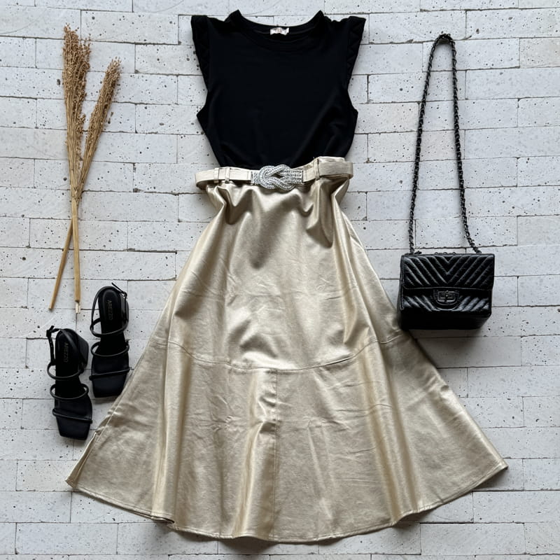 Escolha sua Saia Midi Couro Fake com Cinto Premium Dourada com nosso PROVADOR VIRTUAL