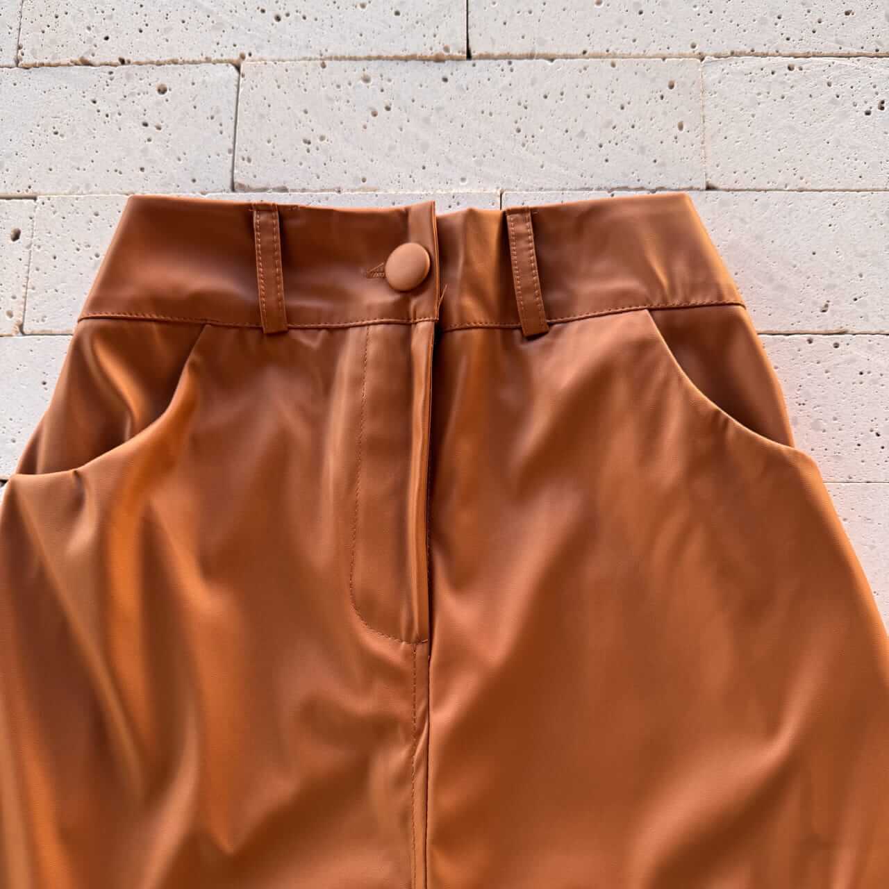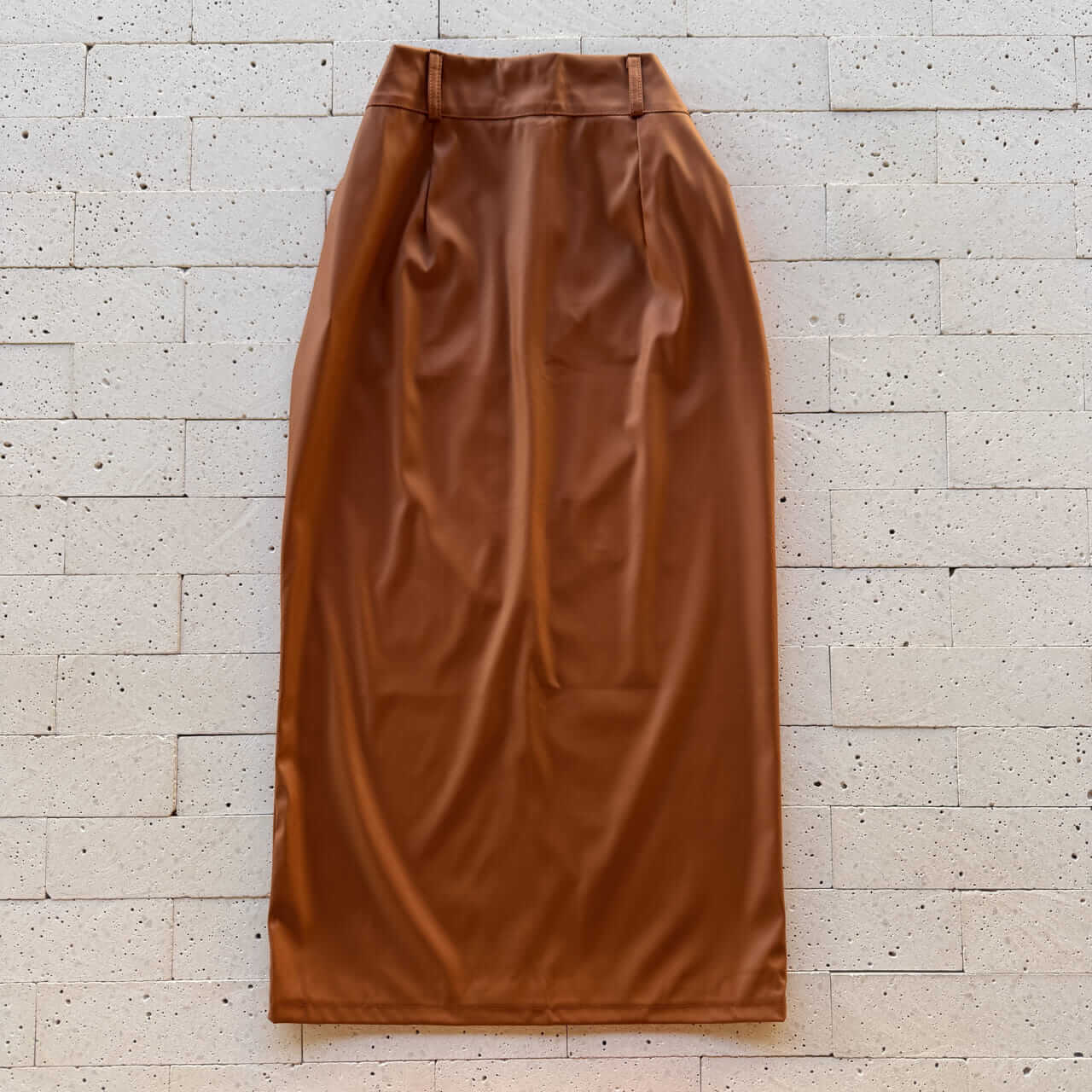 Garanta já a sua SAIA MIDI DE COURO SINTÉTICO COM FENDA CARAMELO e aproveite nossos benefícios: Envio Rápido para todo o Brasil e pagamento em até 12x sem juros!