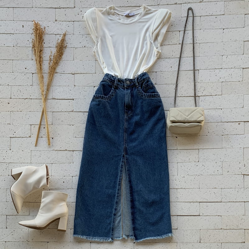 Escolha sua Saia Midi Jeans Premium com Fenda com nosso PROVADOR VIRTUAL