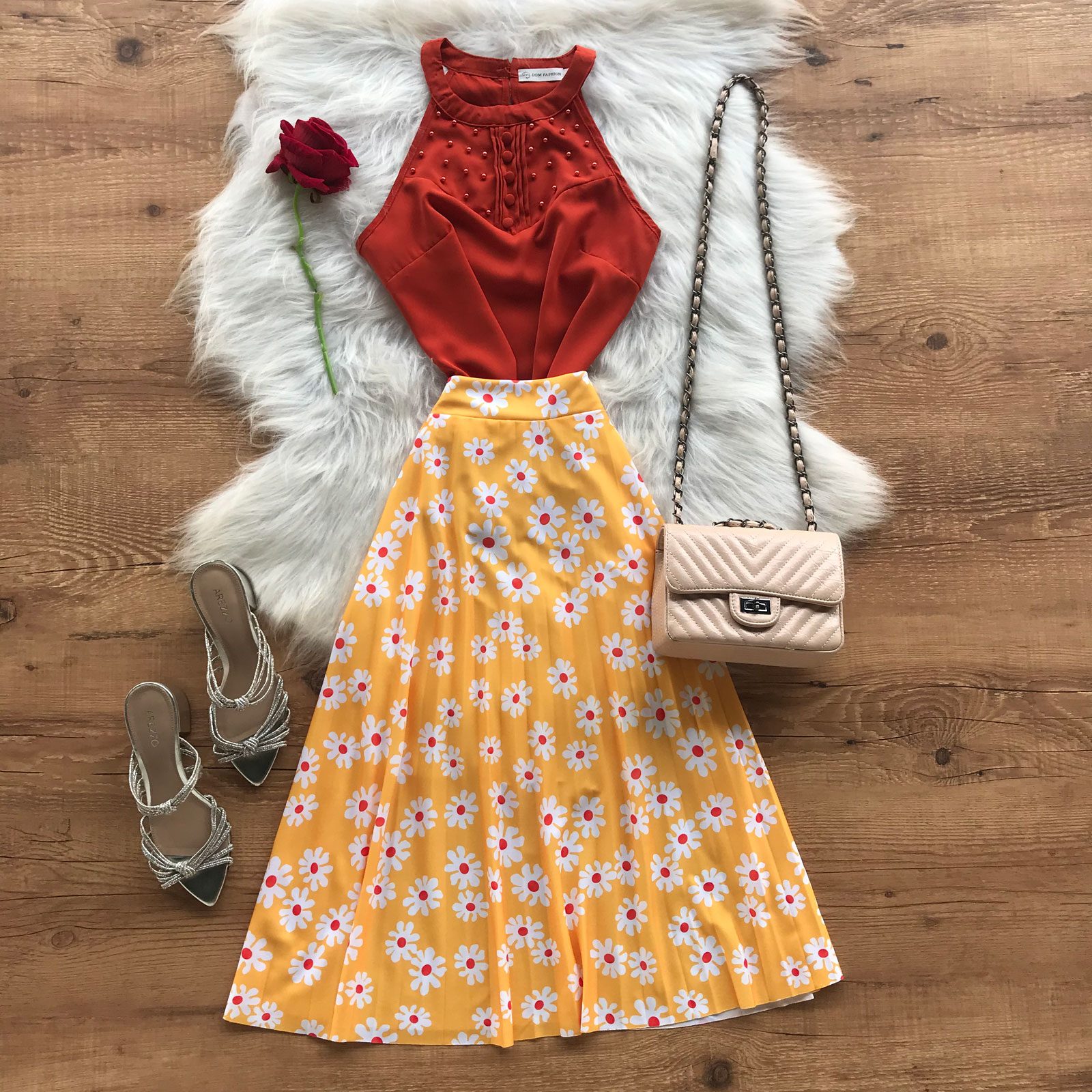Como usar sua Saia Midi Plissada Margaridas Amarela
