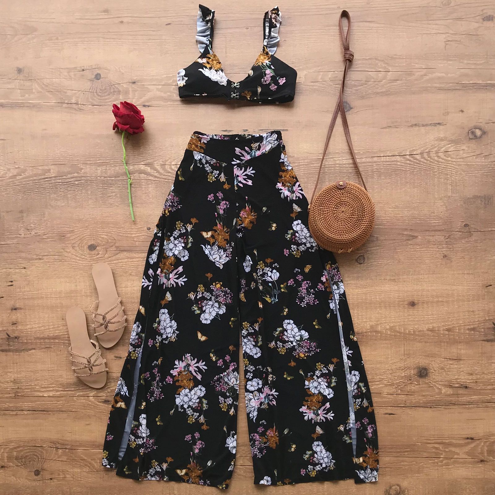 Saída de Praia Calça Pantalona Floral Preto