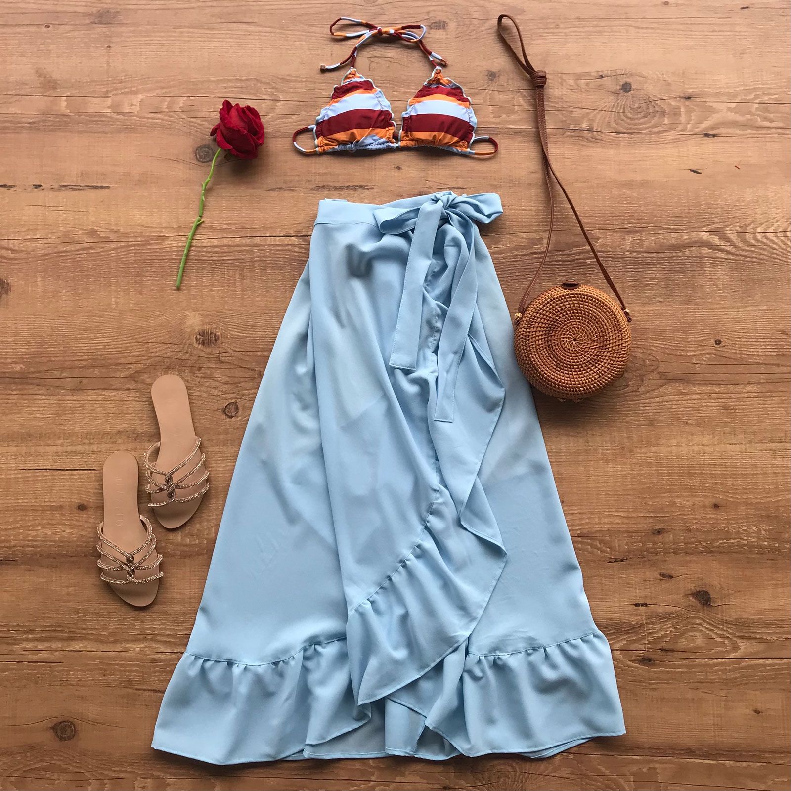 Elas são ótimas para quem quer ficar bronzeada apenas na parte de cima, deixando a parte do quadril e pernas protegida. Também são boa opções para os momentos em que você quer deixar a parte de baixo coberta, mais comportada, porém não quer usar roupas convencionais. Elas ainda podem ser usadas no dia a dia, como saia envelope. Aposte em bodys mais sequinhos com a saia por cima e sandálias de salto com tiras finas. Se preferir algo mais confortável, invista em sandálias flat.