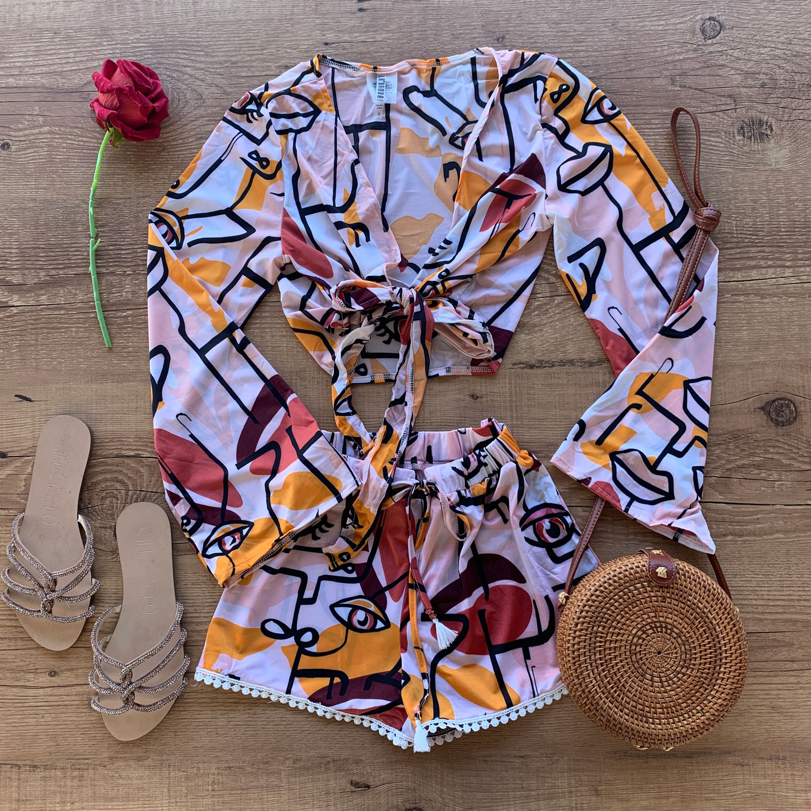 Saída de Praia Top com Amarração Estampa Olhos Rosê com Laranja