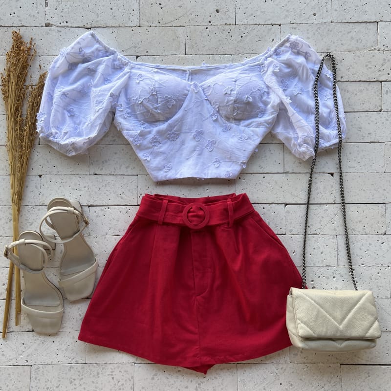 Escolha seu Short Saia Linho com Cinto Fivela Encapada Vermelho com nosso PROVADOR VIRTUAL
