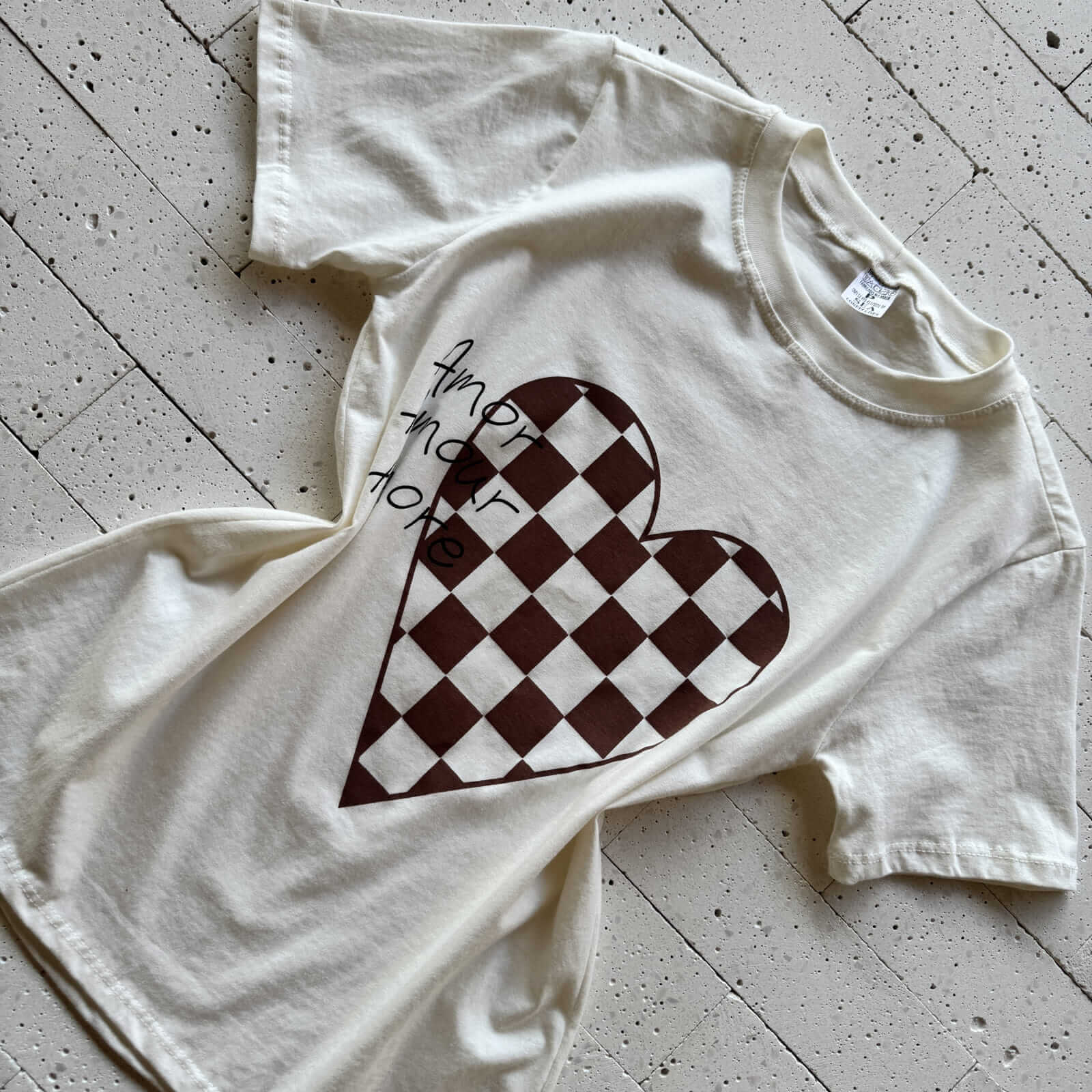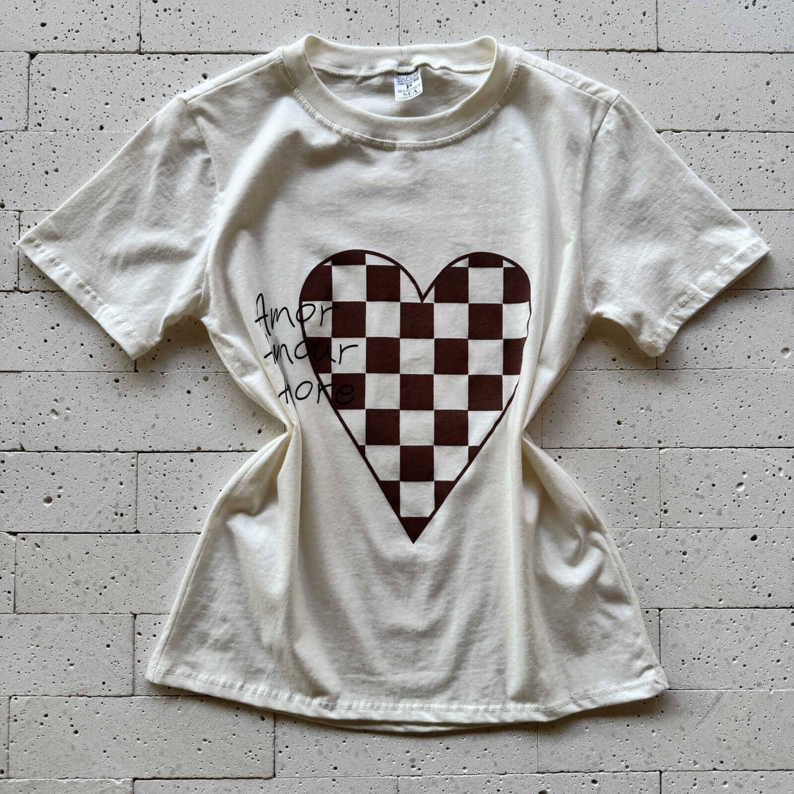 - Estampa: Coração xadrez marrom com lettering “amor”