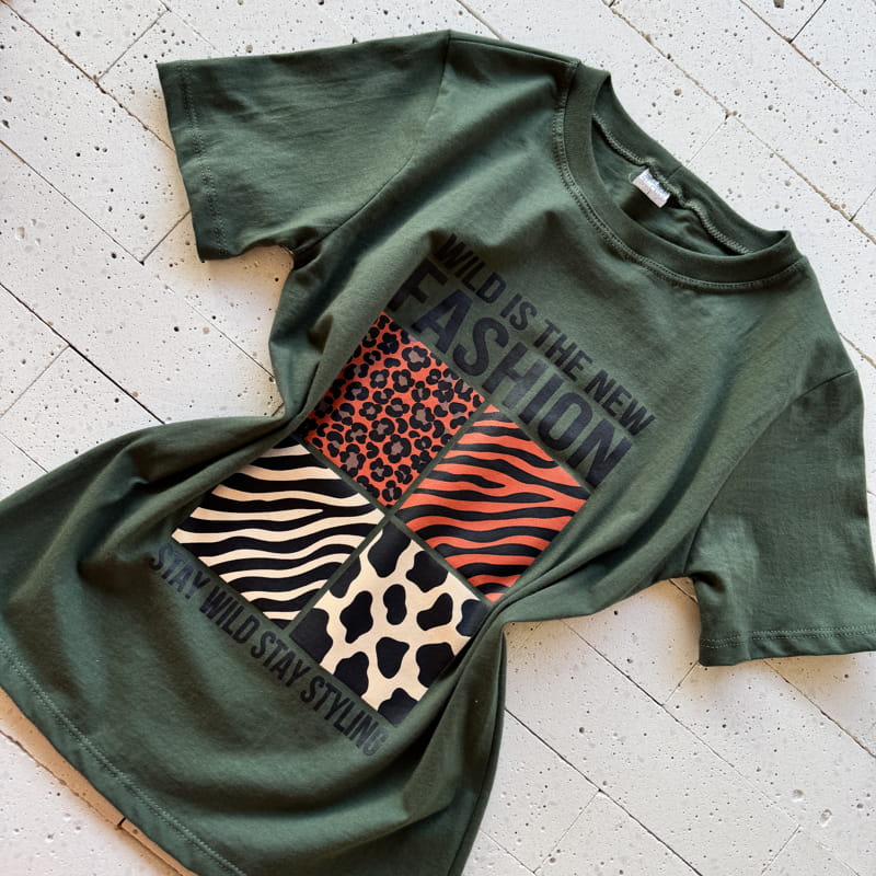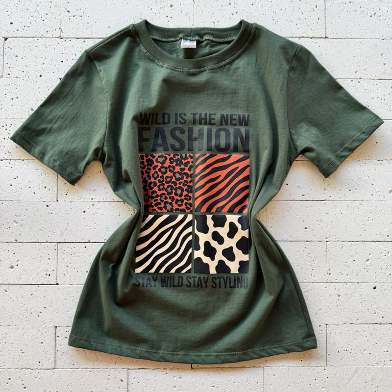 A T-shirt verde oliva com estampa animal print é perfeita para quem ama unir conforto e atitude. Com modelagem reta e tecido 100% algodão, a peça traz quatro estampas animal print em destaque no centro da blusa, acompanhadas das frases “WILD IS THE NEW FASHION” e “STAY WILD STAY STYLING”, que reforçam sua proposta descolada. O caimento da peça é macio e estruturado, ideal para produções modernas com toque urbano e descomplicado.