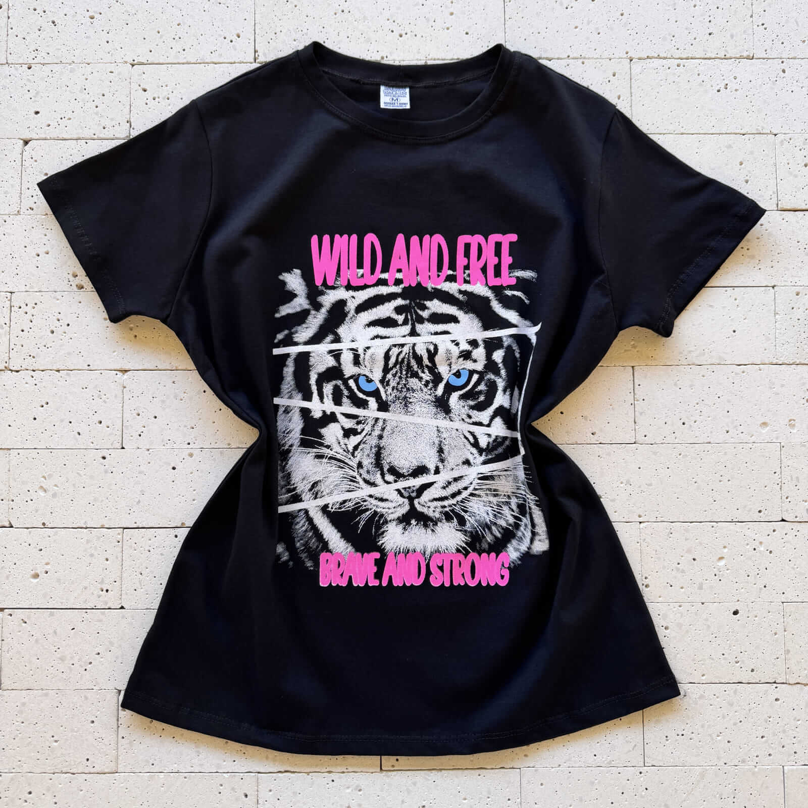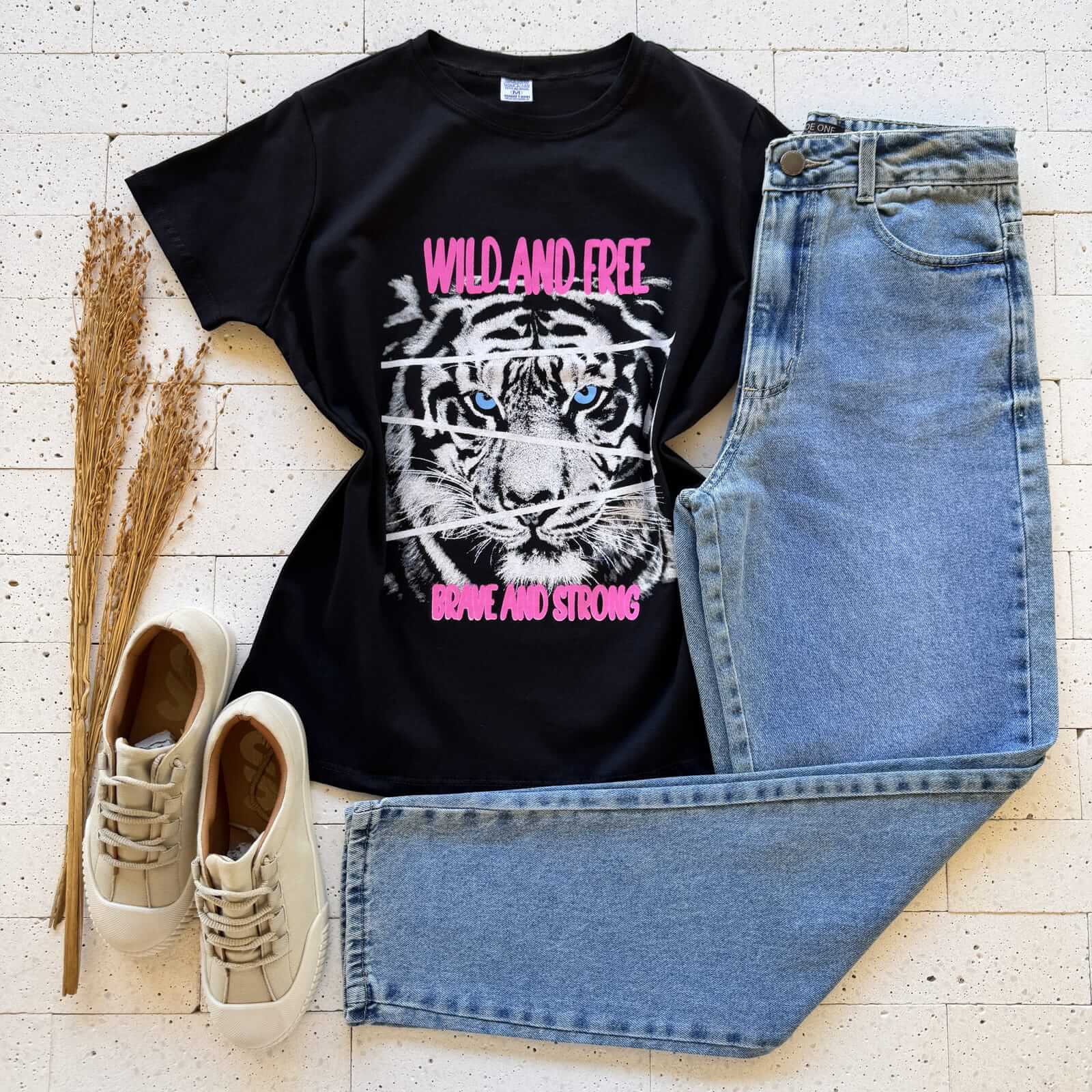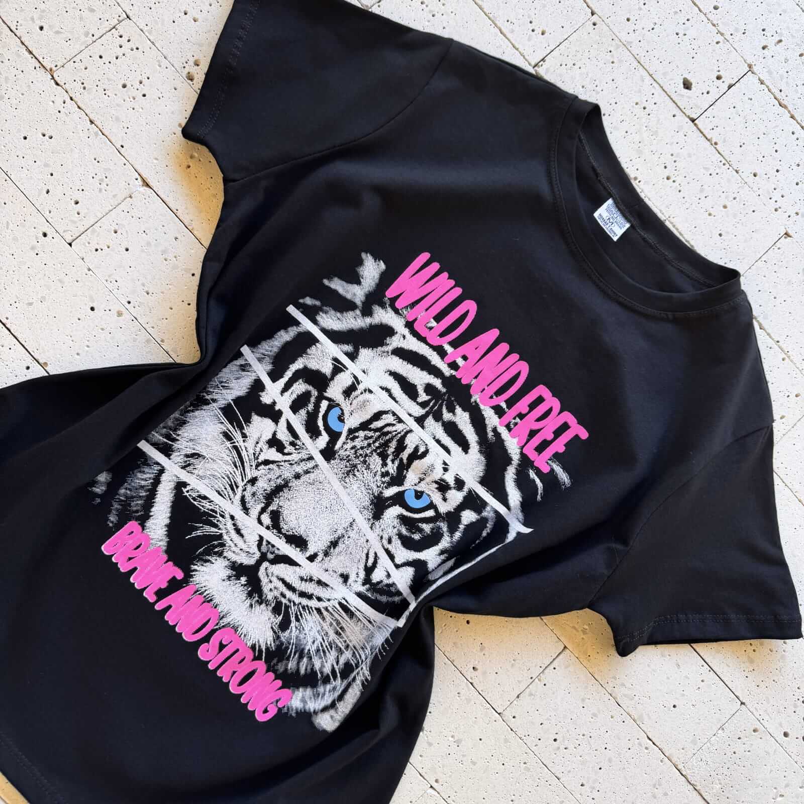 T-SHIRT ALGODÃO ESTAMPA TIGRE WILD AND FREE PRETA – Visual Imponente com Toque Fashion