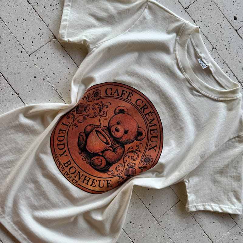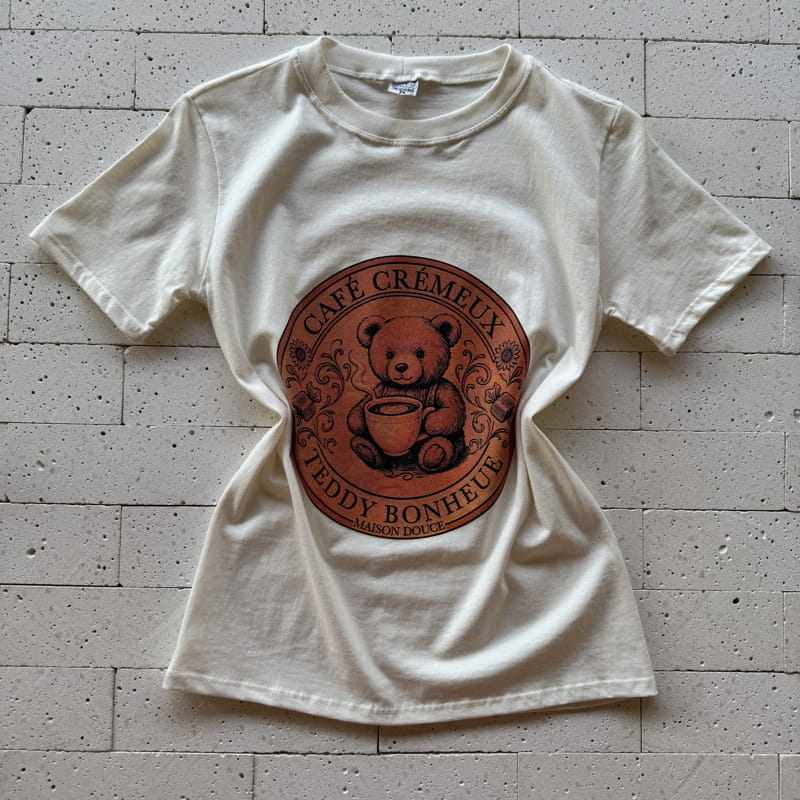 A T-shirt Algodão Estampa Urso Off é a escolha perfeita para quem ama conforto com um toque retrô. Com fundo off white suave e estampa central em tons terrosos, ela traz um adorável urso segurando uma xícara de café com a inscrição “Café Crémeux – Teddy Bonheur”. A modelagem é slim, com gola redonda tradicional. Um item que une delicadeza, nostalgia e estilo casual para o dia a dia.