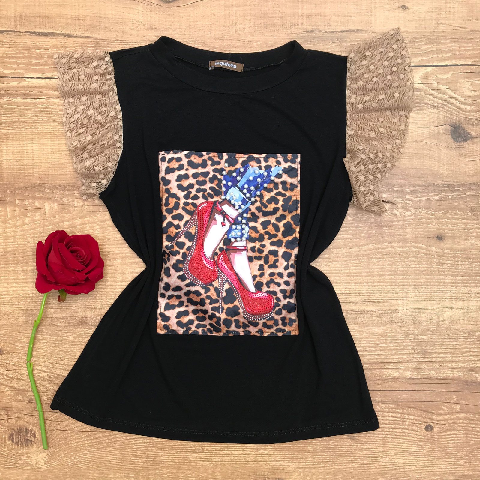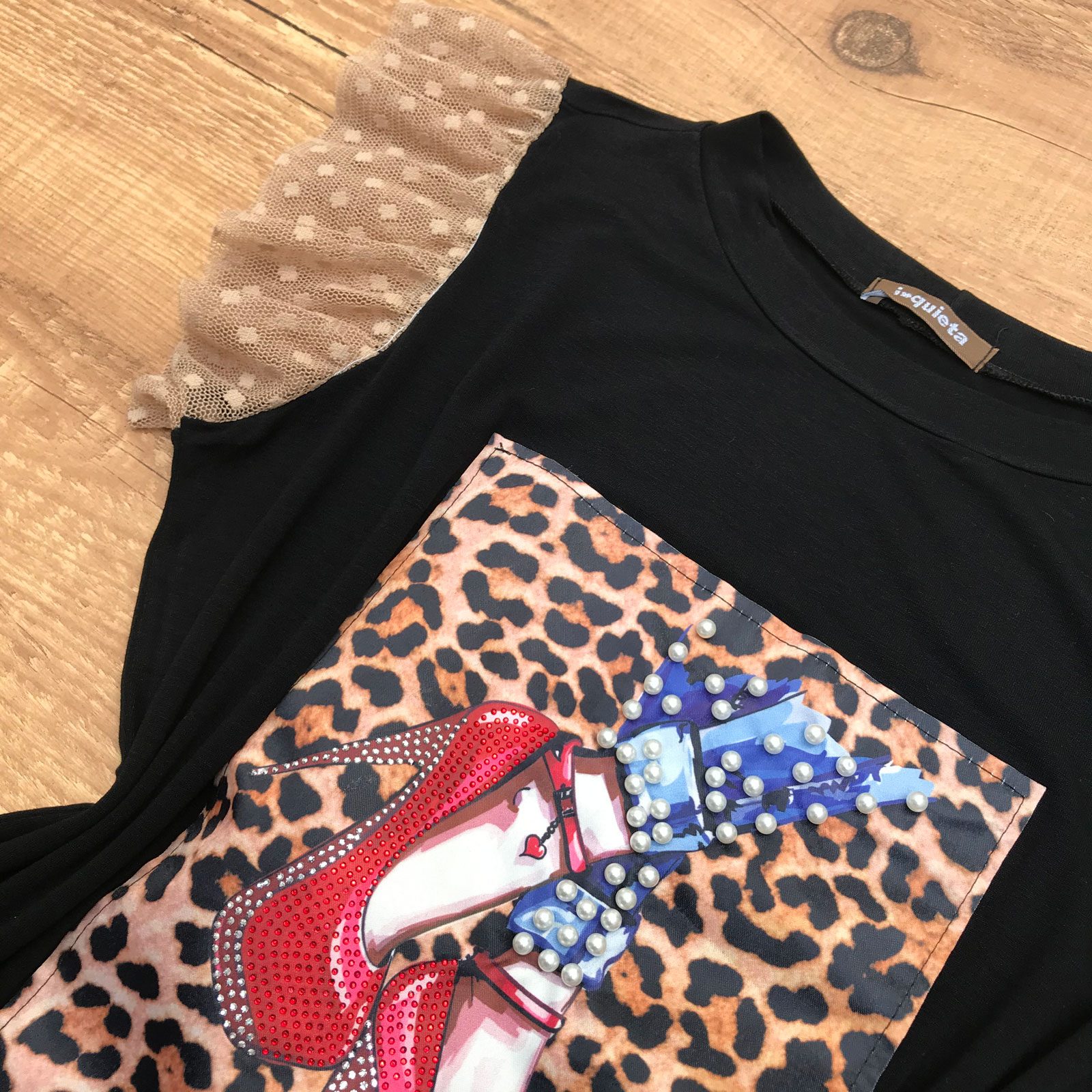 T-SHIRT APLICAÇÃO EM PÉROLAS BABADOS PRETA