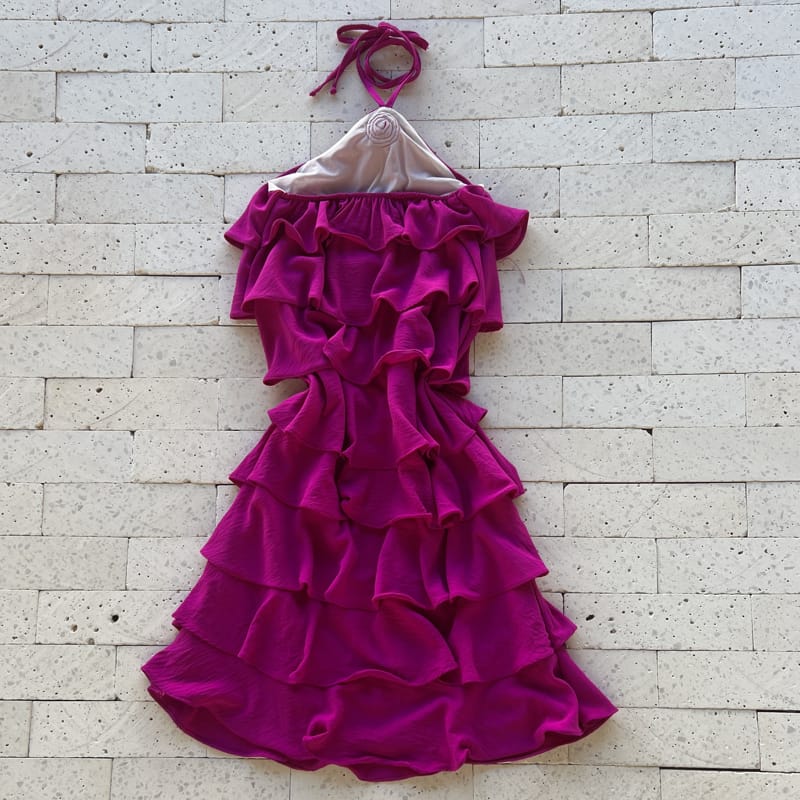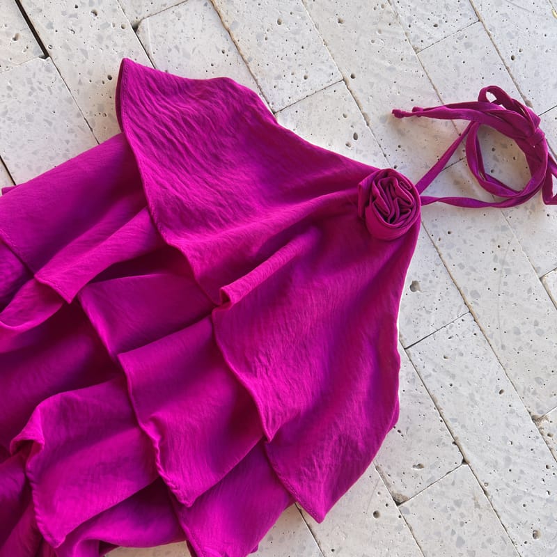 VESTIDO BABADOS CAMADAS COM FLOR NO PESCOÇO MAGENTA