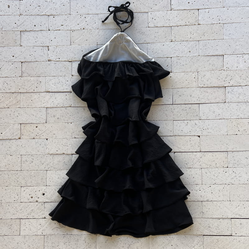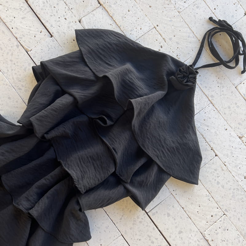 VESTIDO BABADOS CAMADAS COM FLOR NO PESCOÇO PRETO