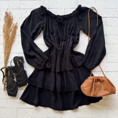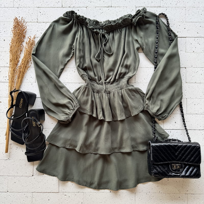 O Vestido Boho Ciganinha Manga Longa Preto traz sofisticação e fluidez em um modelo que une conforto e estilo. Confeccionado em viscose leve e fresca, o vestido apresenta decote ciganinha com elástico e ajuste por amarração no busto, mangas longas com punhos franzidos e modelagem com camadas delicadas na saia. A cintura possui elástico embutido que modela suavemente, proporcionando caimento fluido e marcando a silhueta de forma charmosa.