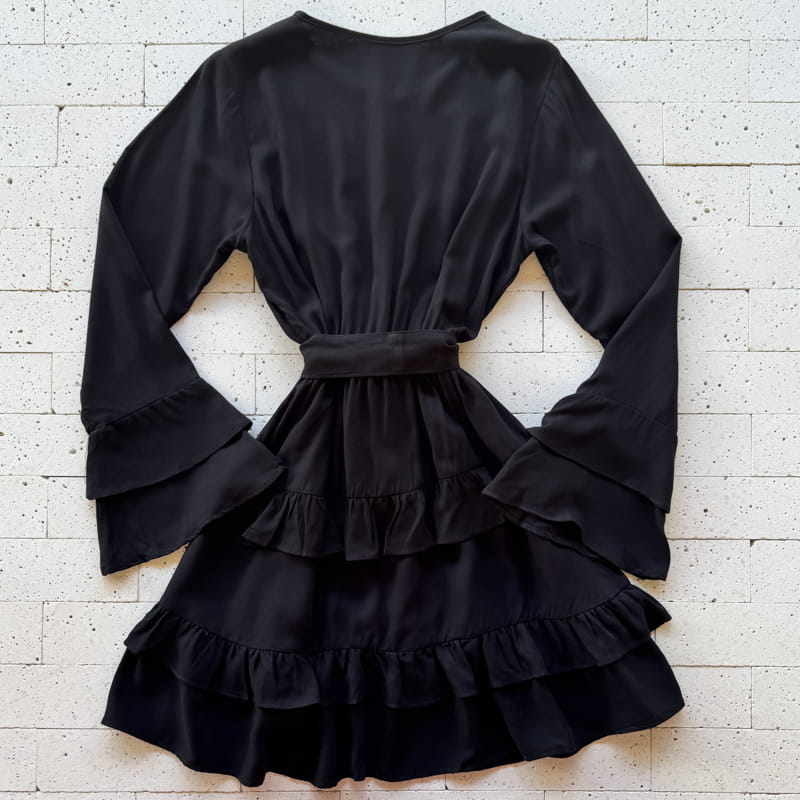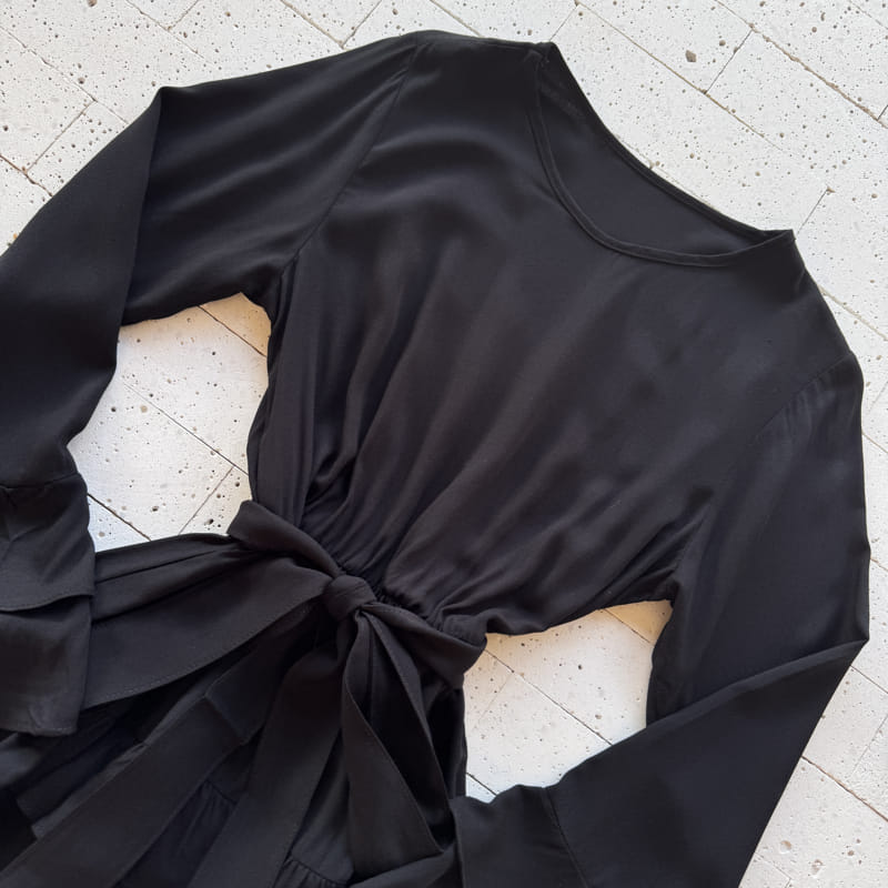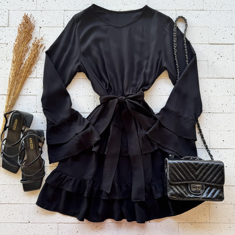 Vestido Boho com Amarração e Manga Flare Preto – Elegância com babados e mangas amplas