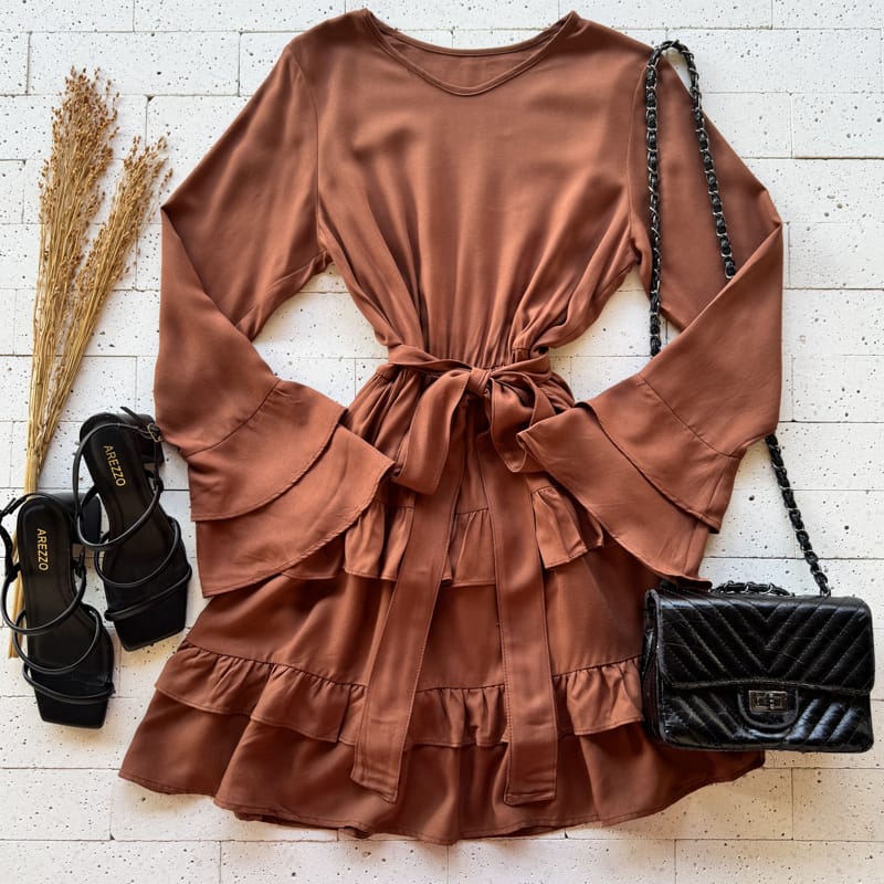 O Vestido Boho com Amarração e Manga Flare Preto é uma peça charmosa que une leveza e sofisticação em cada detalhe. Com mangas longas flare em camadas e saia com babados, ele cria um visual fluido e marcante. A amarração frontal com faixa do mesmo tecido realça a cintura e valoriza a silhueta com delicadeza. Confeccionado em 100% viscose, o vestido tem caimento leve e toque macio. O elástico na cintura oferece conforto e excelente ajuste ao corpo. Um modelo versátil que vai do casual ao sofisticado com apenas a troca de acessórios.