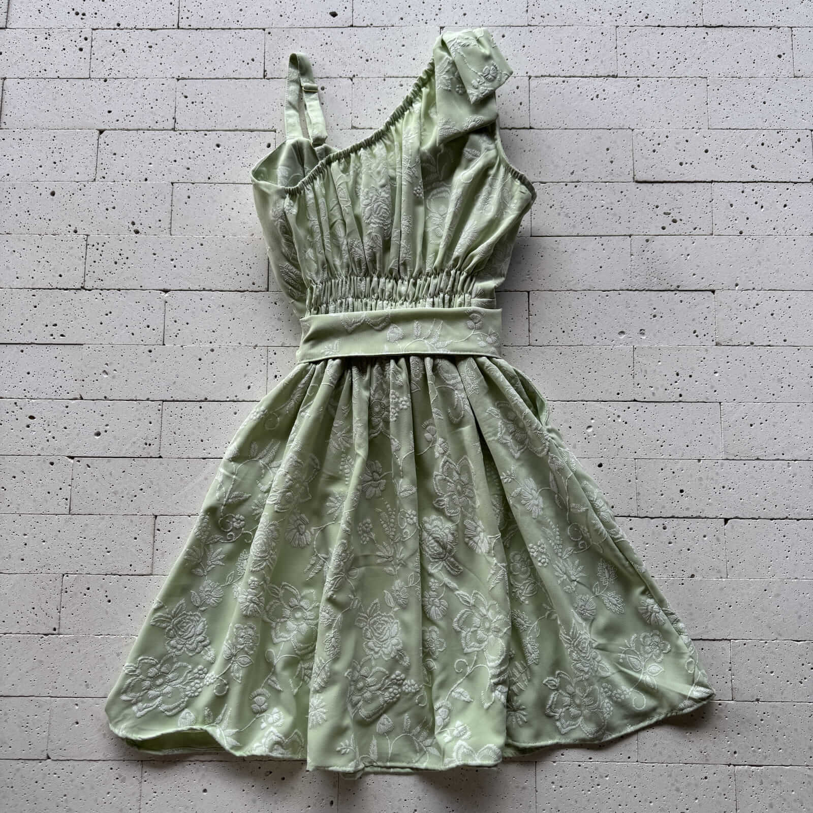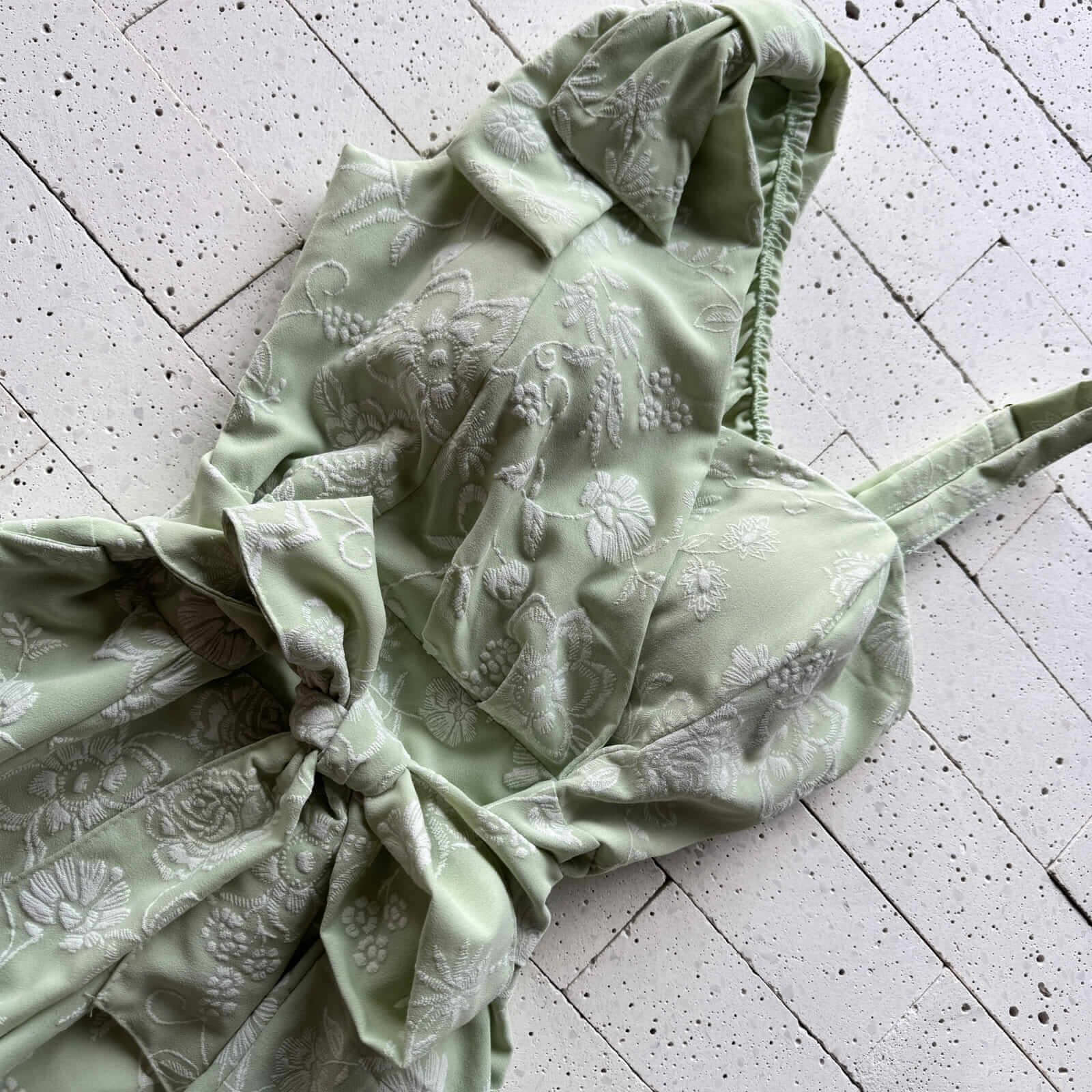 Vestido Bordado Laço no Ombro e Amarração Fixa Verde – Elegância Romântica e Feminina