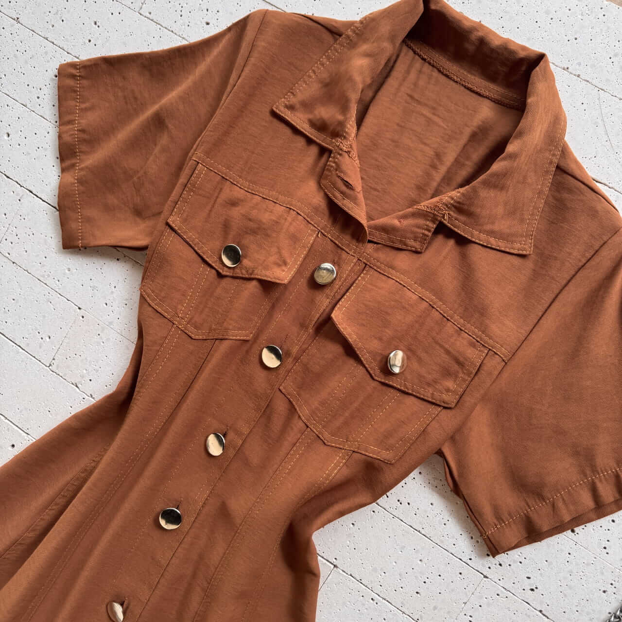 O Vestido Chemise Longuete Marrom é uma peça versátil e refinada para quem busca elegância com praticidade no dia a dia. Com modelagem chemise e comprimento longuete, o vestido apresenta gola clássica, mangas curtas, fechamento frontal por botões e bolsos no busto com lapela, trazendo um visual moderno com inspiração utilitária. O elástico nas costas valoriza a cintura e proporciona ajuste mais confortável ao corpo, enquanto a saia ampla oferece movimento leve e caimento fluido.