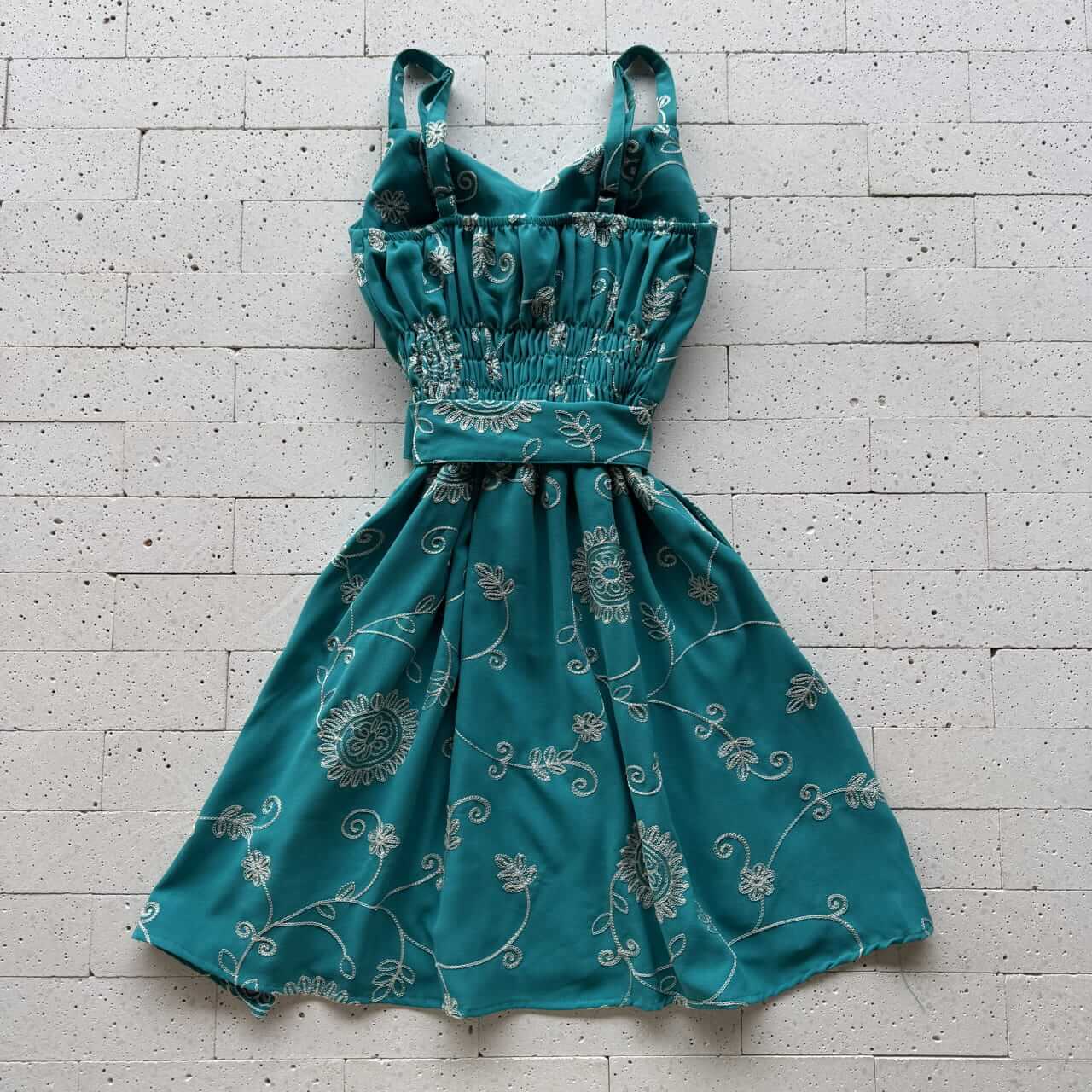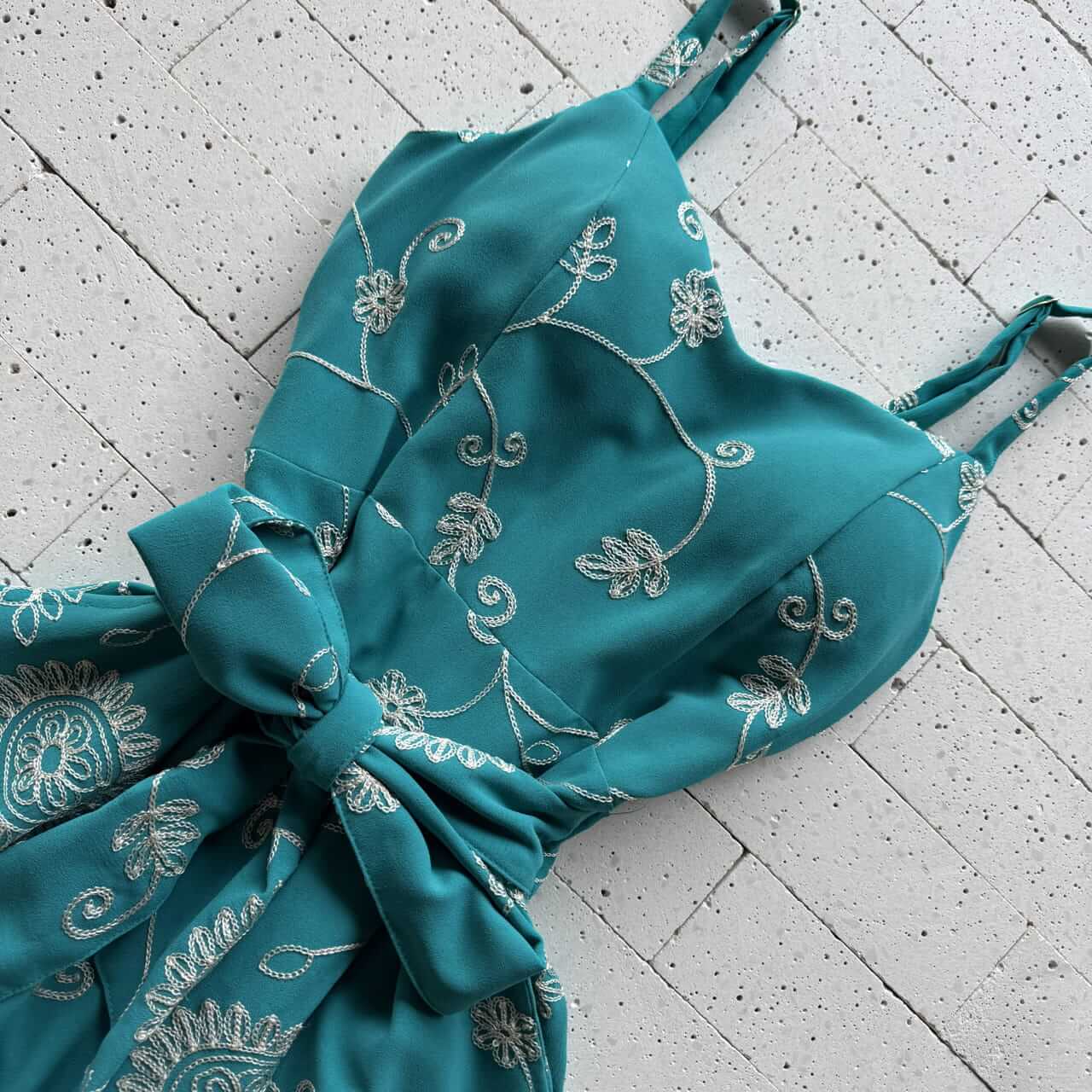 VESTIDO CREPE BORDADO ALCINHA E CINTO FAIXA TURQUESA – Elegância com delicadeza