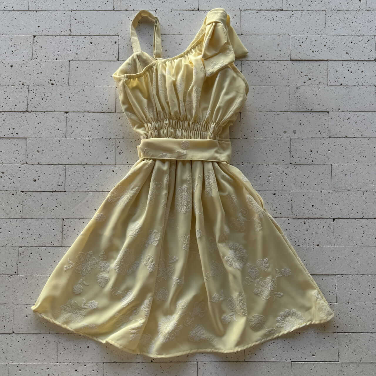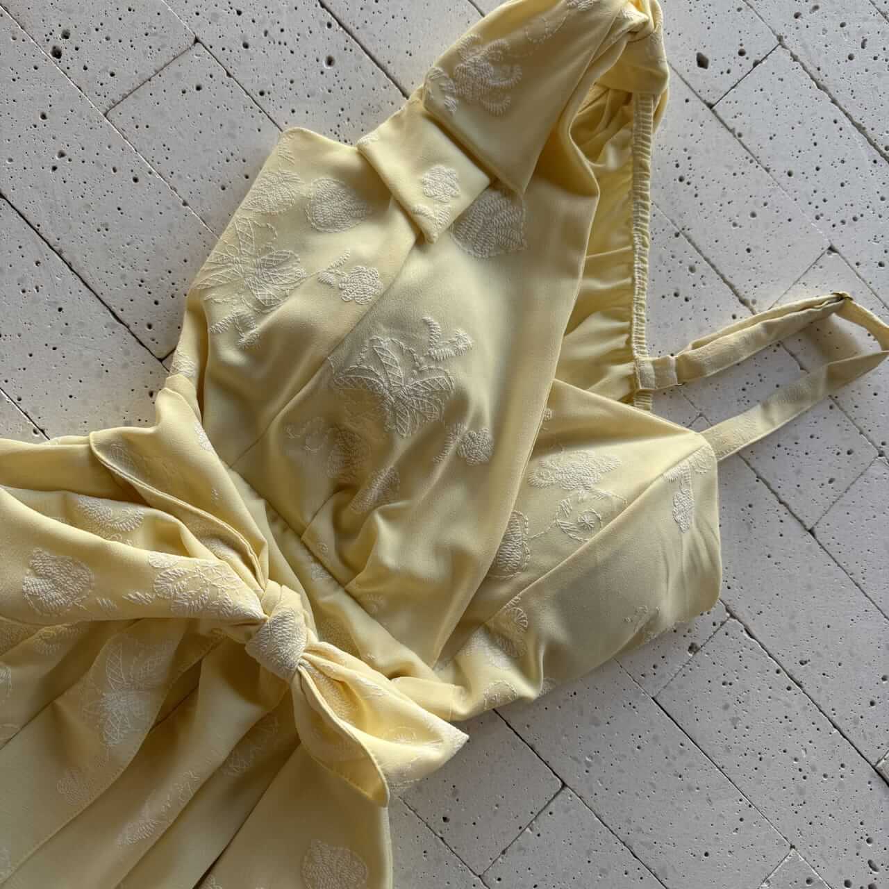 VESTIDO CREPE BORDADO LAÇO NO OMBRO E AMARRAÇÃO FIXA AMARELO
