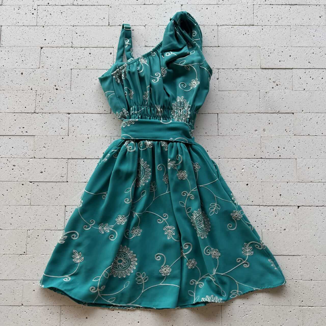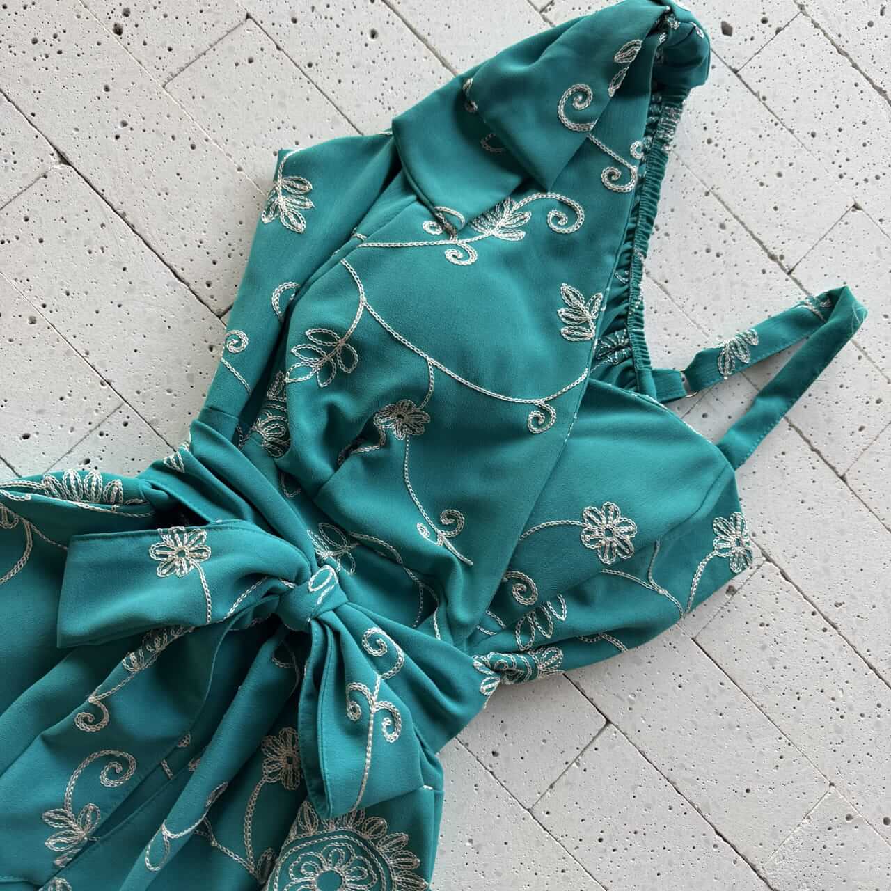 VESTIDO CREPE BORDADO LAÇO NO OMBRO E AMARRAÇÃO FIXA TURQUESA – Delicadeza e charme em cada detalhe