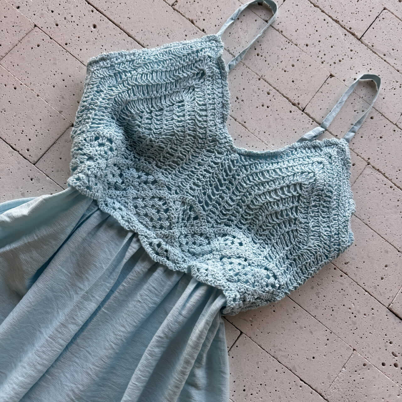 Vestido Detalhe Busto em Crochê Azul – Elegância artesanal com frescor moderno