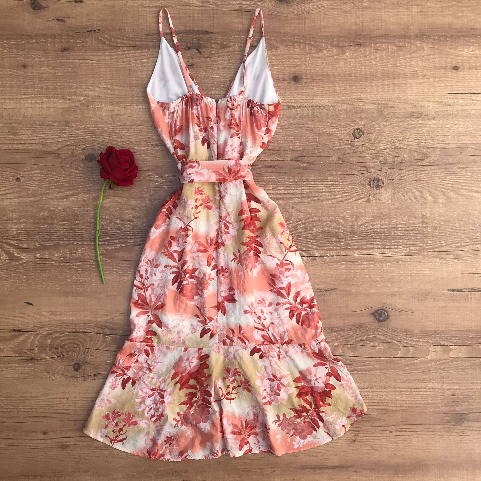 O Vestido Estampado Babados com Cinto Coral é um vestido super alegre, que combina com os dias de lazer da primavera-verão que vem chegando! Fabricado em algodão, é super fresquinho e tem ótimo caimento no corpo. Apresenta barra irregular, sendo mais compridinho atrás e com detalhes de babados na barra. A peça acompanha cinto que modela muito bem o corpo e possui decote transpassado em formato V. A estampa floral está super em alta e casa muito bem com o modelo do vestido. Possui alças reguláveis e fechamento em zíper nas costas, facilitando a adaptação e o conforto na hora de vestir.