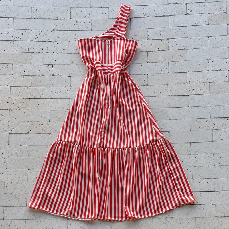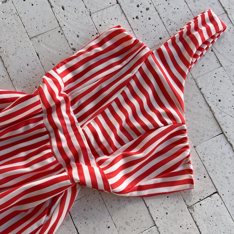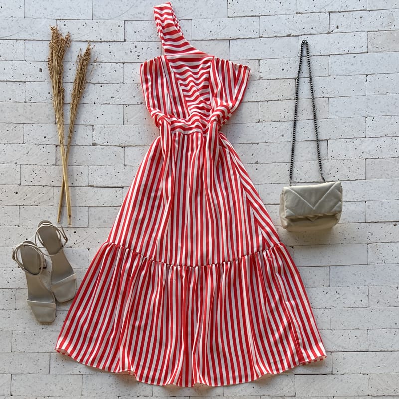 VESTIDO LISTRADO MIDI UM OMBRO SÓ LUXO VERMELHO