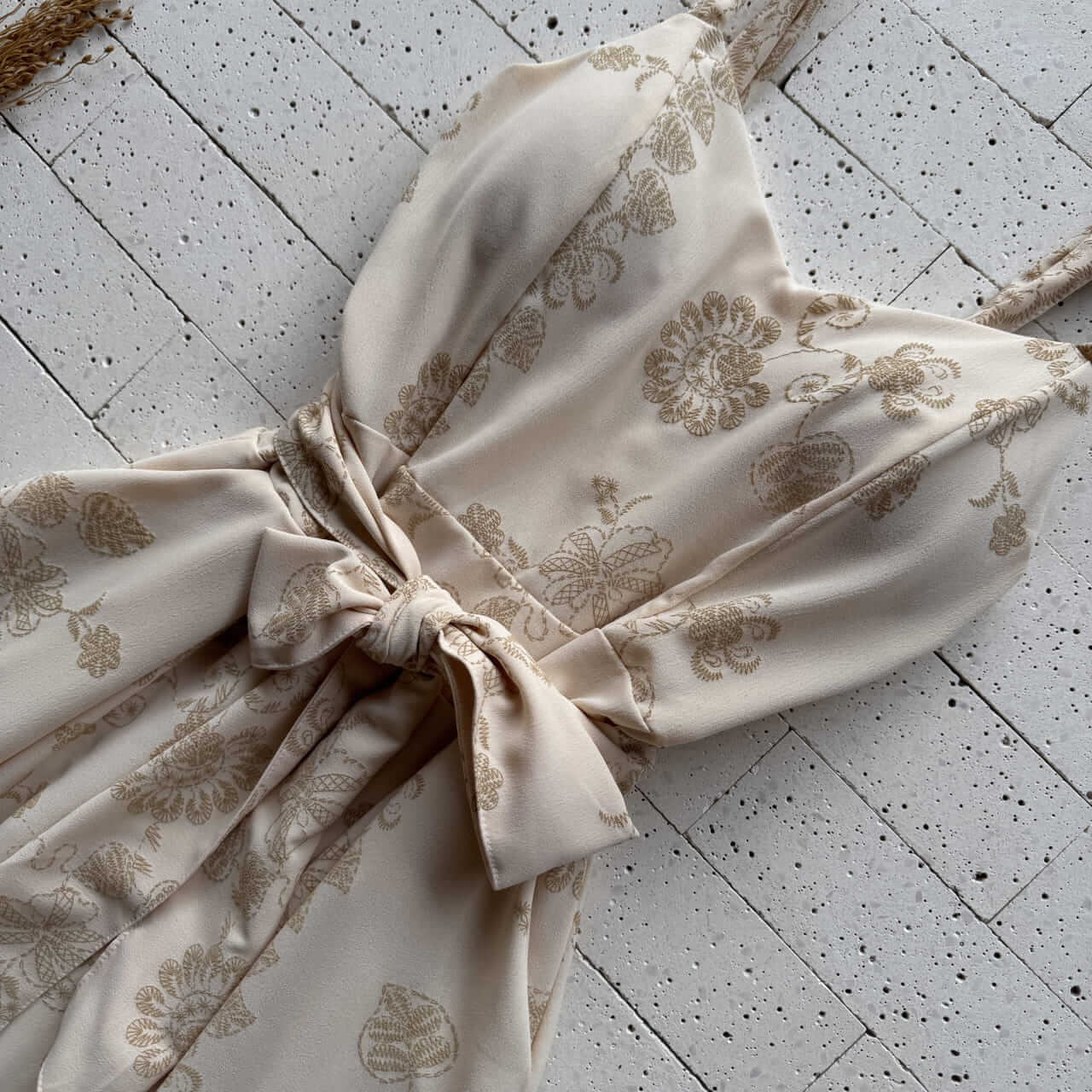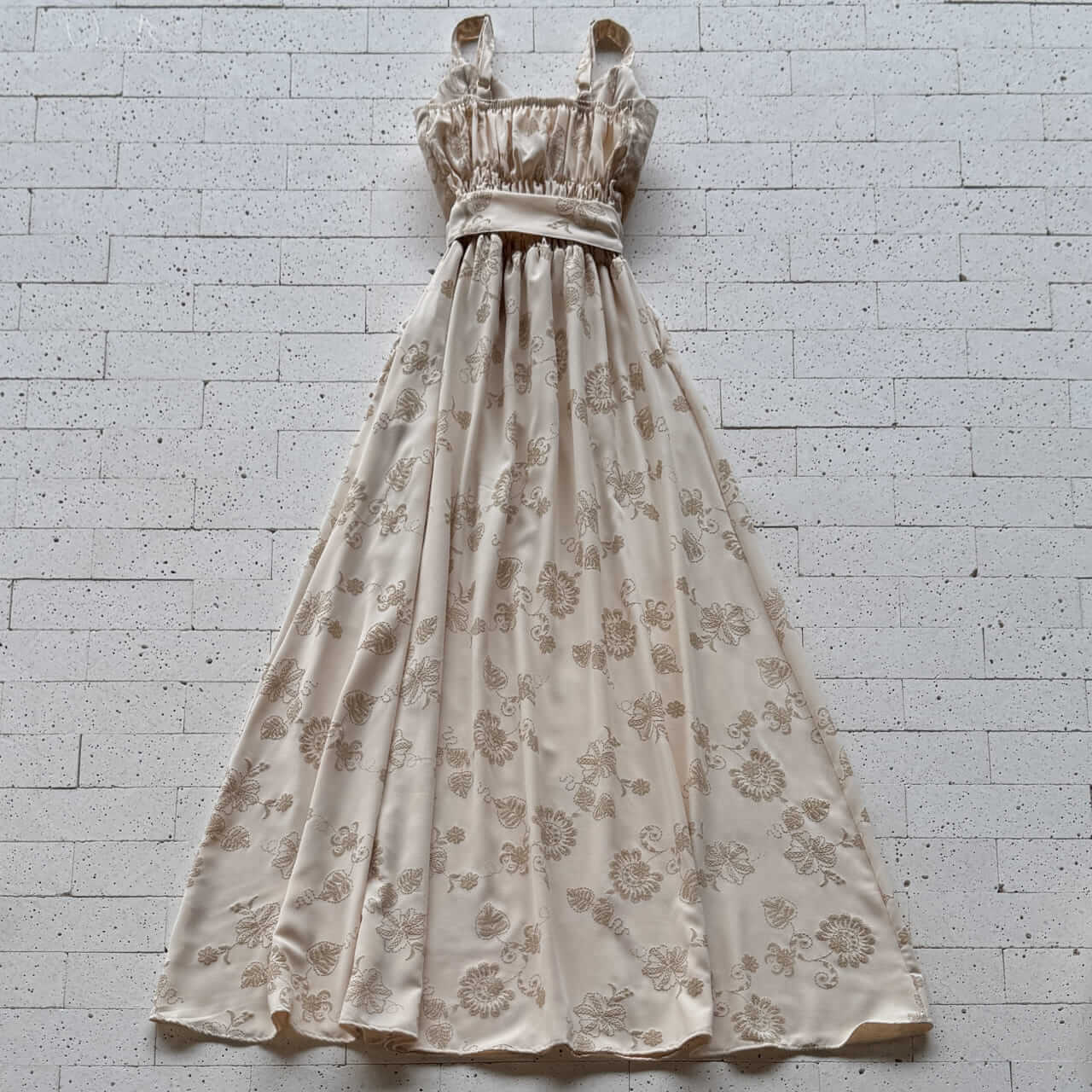 VESTIDO LONGO BORDADO ALCINHA E AMARRAÇÃO FIXA BEGE