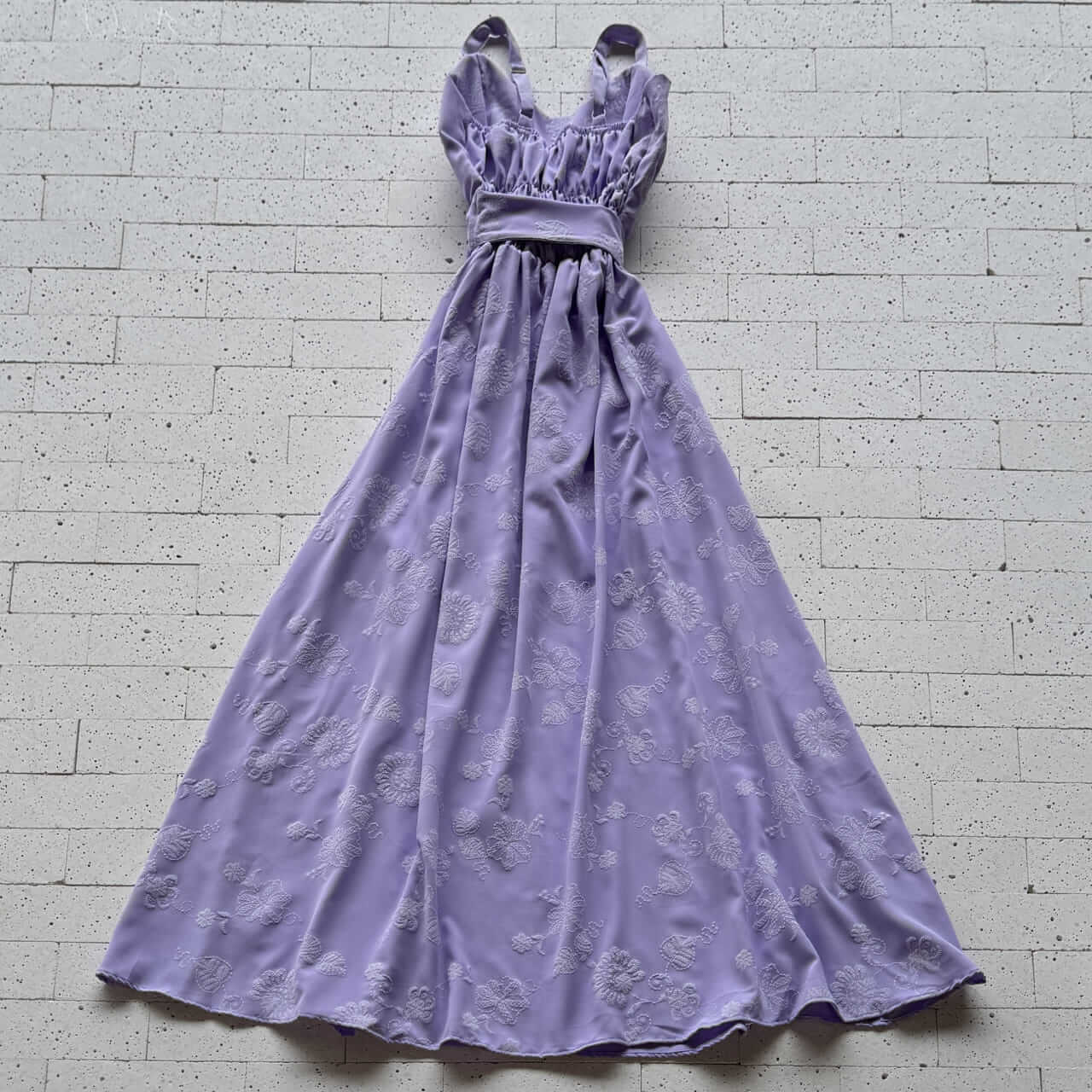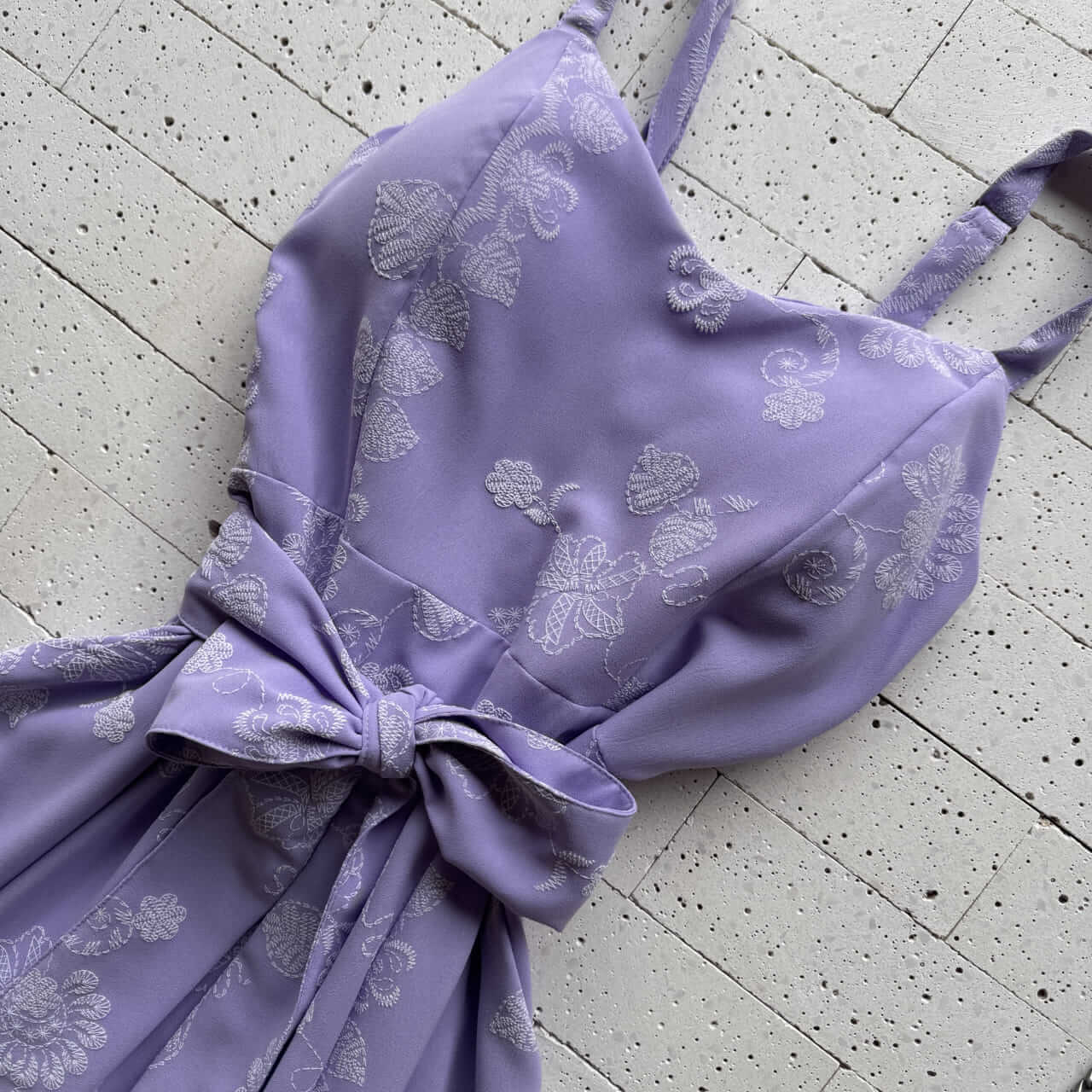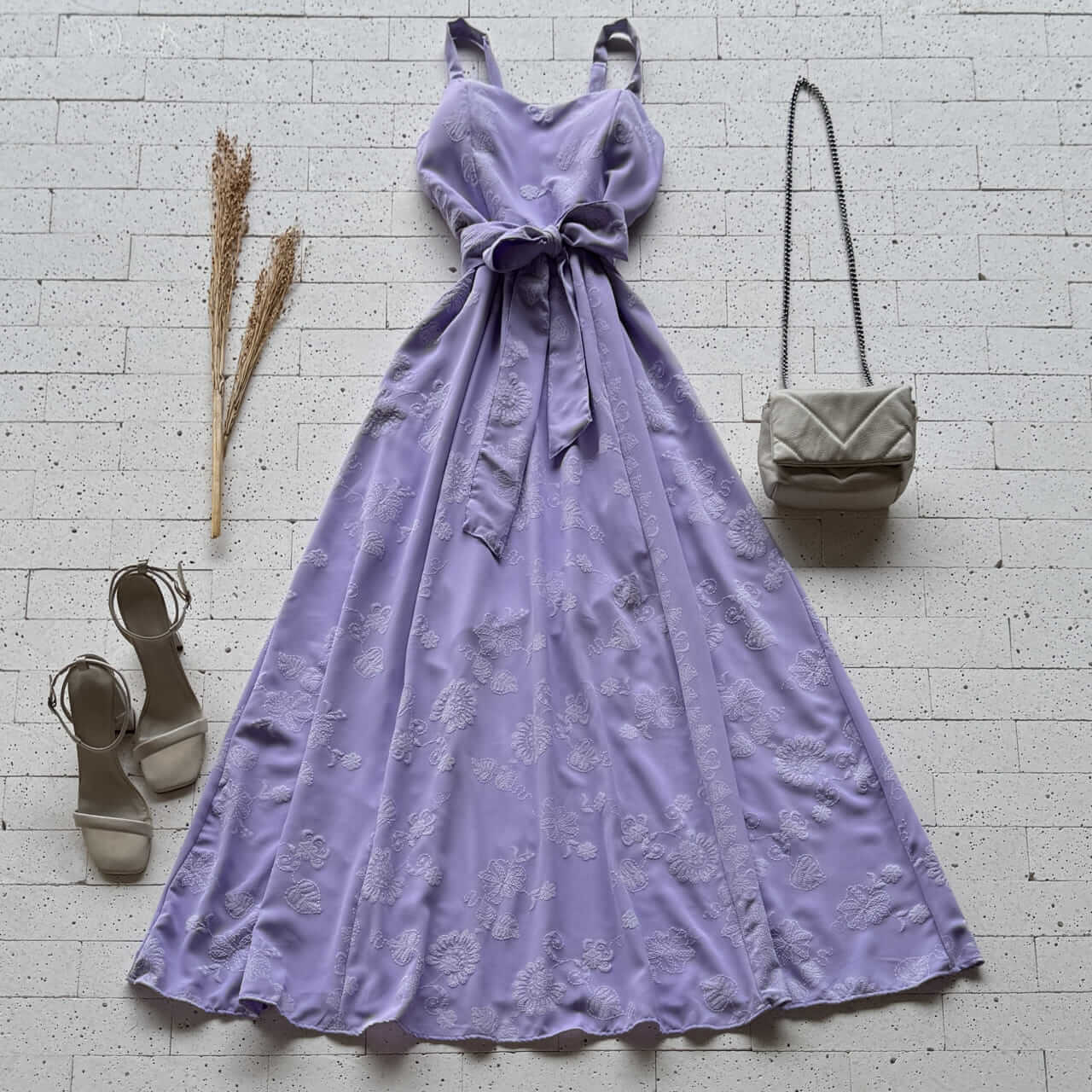 VESTIDO LONGO BORDADO ALCINHA E AMARRAÇÃO FIXA LAVANDA
