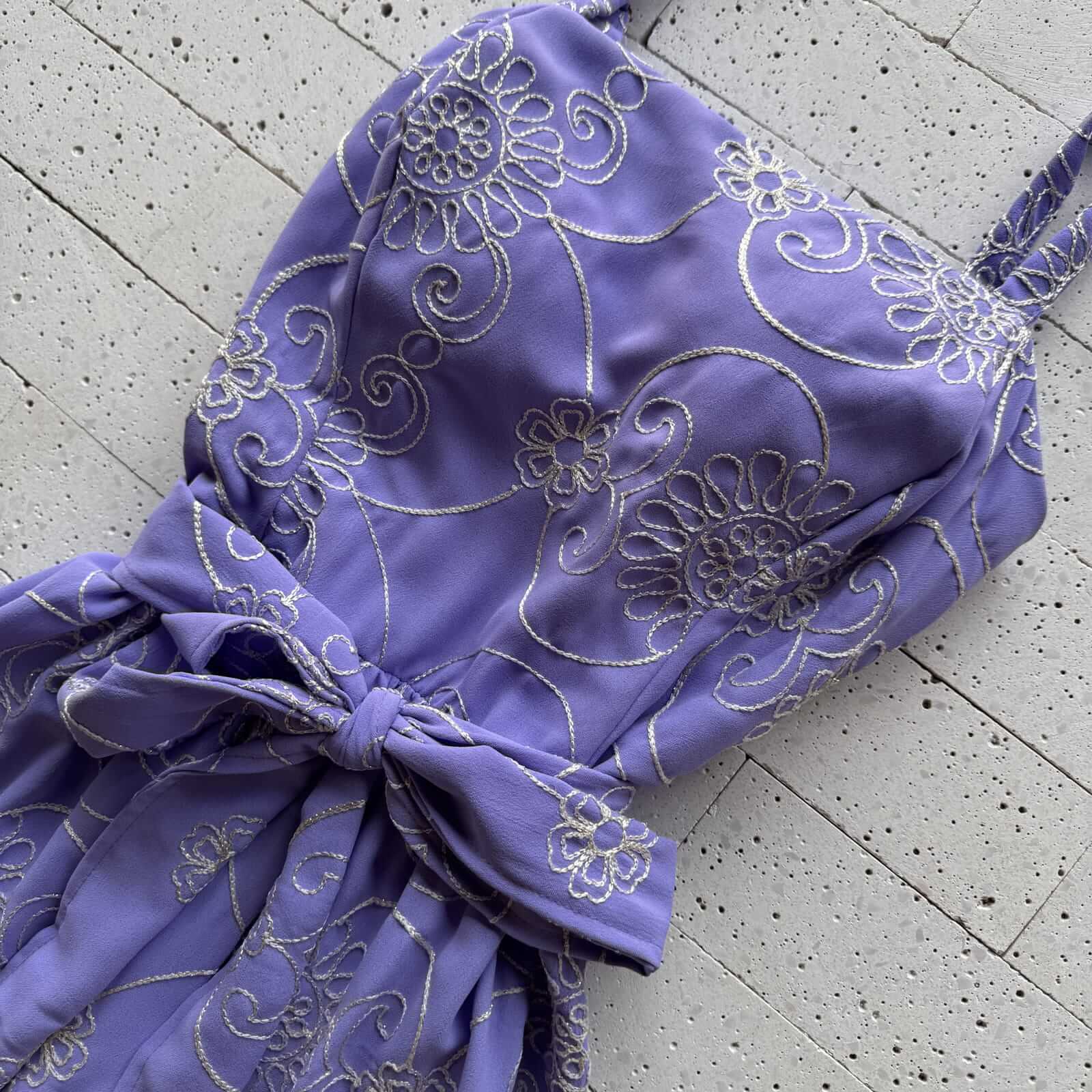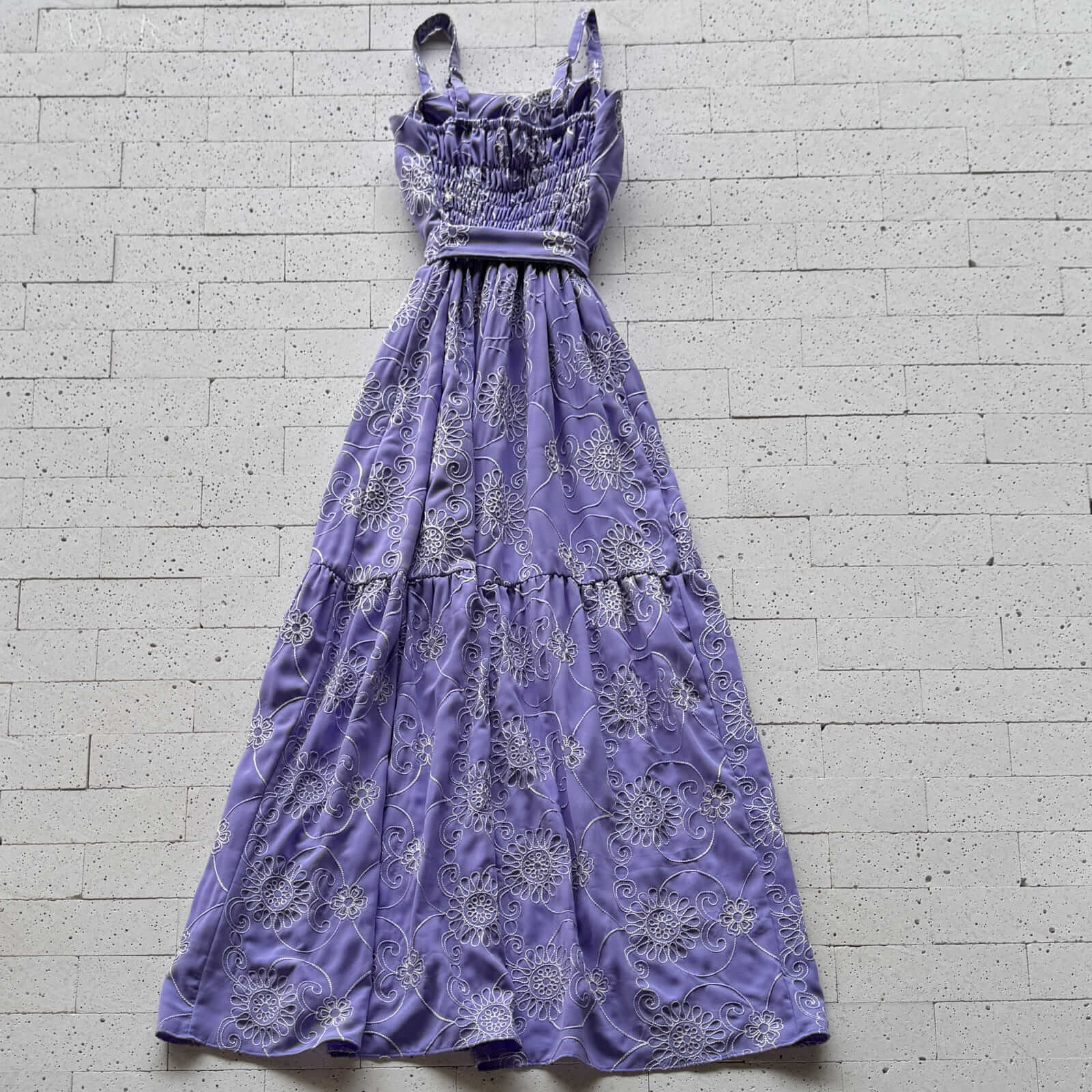 VESTIDO LONGO BORDADO CAMADAS E AMARRAÇÃO FIXA ROXO – Elegância e romantismo em cada detalhe
